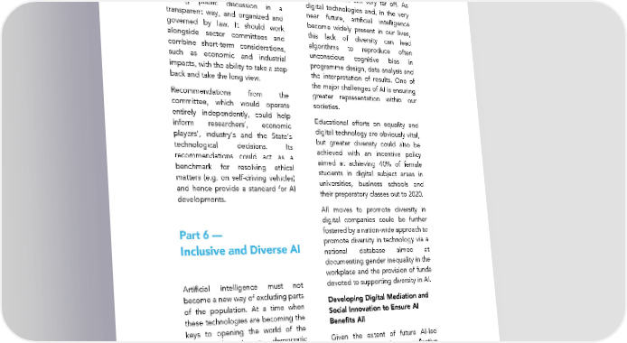Executive summary fallible though it is, must not be Parity and Diversity: Acting to replaced by a machine? Promote Equality Setting Up an AI Ethics Committee Despite the slow but steady Our mission recommends the creation feminization of scientific and technical of a digital technology and AI ethics sectors, digital technologies remain committee that is open to society. something of an exception, with This body would be in charge of gender balance still very far off. As leading public discussion in a digital technologies and, in the very transparent way, and organized and near future, artificial intelligence governed by law. It should work become widely present in our lives, alongside sector committees and this lack of diversity can lead combine short-term considerations, algorithms to reproduce often such as economic and industrial unconscious cognitive bias in impacts, with the ability to take a step programme design, data analysis and back and take the long view. the interpretation of results. One of the major challenges of AI is ensuring Recommendations from the greater representation within our committee, which would operate societies. entirely independently, could help Educational efforts on equality and inform researchers’, economic digital technology are obviously vital, players’, industry’s and the State’s but greater diversity could also be technological decisions. Its achieved with an incentive policy recommendations could act as a aimed at achieving 40% of female benchmark for resolving ethical students in digital subject areas in matters (e.g. on self-driving vehicles) universities, business schools and and hence provide a standard for AI their preparatory classes out to 2020. developments. All moves to promote diversity in digital companies could be further Part 6 — fostered by a nation-wide approach to promote diversity in technology via a Inclusive and Diverse AI national database aimed at documenting gender inequality in the workplace and the provision of funds Artificial intelligence must not devoted to supporting diversity in AI. become a new way of excluding parts Developing Digital Mediation and of the population. At a time when Social Innovation to Ensure AI these technologies are becoming the Benefits All keys to opening the world of the future, this is a democratic Given the extent of future AI-led requirement. AI creates vast transformation, we have a collective opportunities for value creation and responsibility to ensure that no-one the development of our societies and gets left behind. For everyone to truly individuals, but these opportunities benefit from breakthroughs made in must benefit everyone across the AI, our procedures for access to rights board. must change and our mediation capabilities must also be considerably bolstered. So our mission puts forward a proposal to set up an