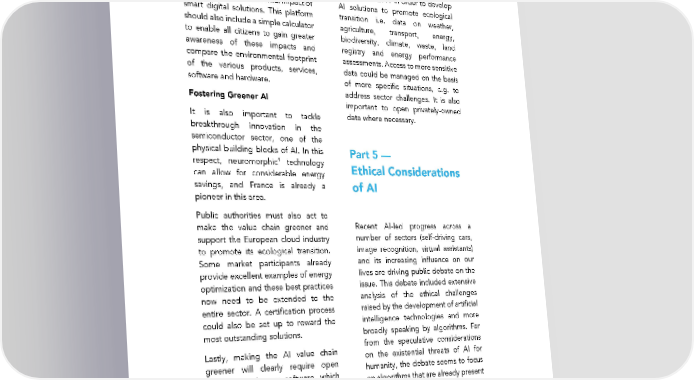 Executive summary promoting projects at the crossroads Dissemination of Ecological Data of life sciences and ecology, climate The development of green AI is only and weather research. feasible if ecological data can be Consumers must also play a part in open. So it is vital to make currently making these technologies greener. available public data open to all, both Our task force therefore proposes the researchers and European companies creation of a platform devoted to alike, out to 2019 in order to develop assessing the environmental impact of AI solutions to promote ecological smart digital solutions. This platform transition i.e. data on weather, should also include a simple calculator agriculture, transport, energy, to enable all citizens to gain greater biodiversity, climate, waste, land awareness of these impacts and registry and energy performance compare the environmental footprint assessments. Access to more sensitive of the various products, services, data could be managed on the basis software and hardware. of more specific situations, e.g. to Fostering Greener AI address sector challenges. It is also important to open privately-owned It is also important to tackle data where necessary. breakthrough innovation in the semiconductor sector, one of the physical building blocks of AI. In this Part 5 — respect, neuromorphic4 technology Ethical Considerations can allow for considerable energy savings, and France is already a of AI pioneer in this area. Public authorities must also act to make the value chain greener and Recent AI-led progress across a support the European cloud industry number of sectors (self-driving cars, to promote its ecological transition. image recognition, virtual assistants) Some market participants already and its increasing influence on our provide excellent examples of energy lives are driving public debate on the optimization and these best practices issue. This debate included extensive now need to be extended to the analysis of the ethical challenges entire sector. A certification process raised by the development of artificial could also be set up to reward the intelligence technologies and more most outstanding solutions. broadly speaking by algorithms. Far Lastly, making the AI value chain from the speculative considerations greener will clearly require open on the existential threats of AI for hardware and open software, which humanity, the debate seems to focus are not only a confidence indicator on algorithms that are already present but can also lead to significant energy in our daily lives and that can have a savings and provide inspiration for major impact on our day-to-day initiatives currently underway in existence. Europe. If we want to develop AI technologies that comply with our values and social 4. Neuromorphic chips are based on the workings of the human brain.