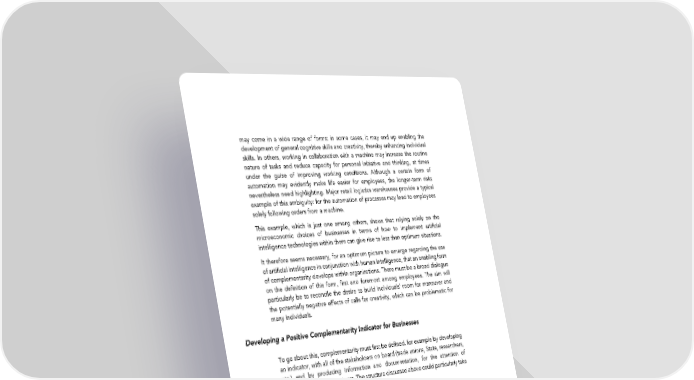 may come in a wide range of forms: in some cases, it may end up enabling the development of general cognitive skills and creativity, thereby enhancing individual skills. In others, working in collaboration with a machine may increase the routine nature of tasks and reduce capacity for personal initiative and thinking, at times under the guise of improving working conditions. Although a certain form of automation may evidently make life easier for employees, the longer-term risks nevertheless need highlighting. Major retail logistics warehouses provide a typical example of this ambiguity: for the automation of processes may lead to employees solely following orders from a machine. This example, which is just one among others, shows that relying solely on the microeconomic choices of businesses in terms of how to implement artificial intelligence technologies within them can give rise to less than optimum situations. It therefore seems necessary, for an optimum picture to emerge regarding the use of artificial intelligence in conjunction with human intelligence, that an enabling form of complementarity develops within organizations. There must be a broad dialogue on the definition of this form, first and foremost among employees. The aim will particularly be to reconcile the desire to build individuals' room for maneuver and the potentially negative effects of calls for creativity, which can be problematic for many individuals. Developing a Positive Complementarity Indicator for Businesses To go about this, complementarity must first be defined, for example by developing an indicator, with all of the stakeholders on board (trade unions, State, researchers, etc.) and by producing information and documentation, for the attention of businesses and social partners. The structure discussed above could particularly take on this role. Next, the ways in which the collective choice of positive complementarity, enabling complementarity, could be made, must also be defined. There could be several ways of doing this. Fully Including Digital Transformation on the Social Dialogue Agenda This firstly requires: An overall approach to digital transformation in social dialogue Beyond the tool designers themselves, users must also be involved at all reporting levels, and across all roles—particularly the human resource department by making provision, as far upstream as possible, not least via strategic workforce planning (GPEC/GEPP), for co-construction and co-innovation in terms of space and time. On the one hand, since employees are in the best position for properly gauging the dimensions of their work activity, taking their experience into account makes it possible to design more effective tools. Indeed, by questioning the future conditions for work performance we can identify, from what already exists, what could be improved. On the other hand, this must enable them to progress from an imposed process to a projective process, guaranteeing a better grasp of the future work situation. In light 92