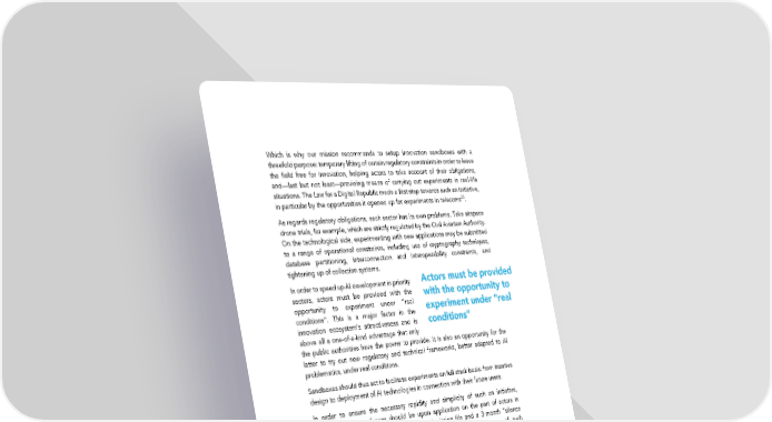 Which is why our mission recommends to setup innovation sandboxes with a threefold purpose: temporary lifting of certain regulatory constraints in order to leave the field free for innovation, helping actors to take account of their obligations, and—last but not least—providing means of carrying out experiments in real-life situations. The Law for a Digital Republic made a first step towards such an initiative, in particular by the opportunities it opened up for experiments in telecoms23. As regards regulatory obligations, each sector has its own problems. Take airspace drone trials, for example, which are strictly regulated by the Civil Aviation Authority. On the technological side, experimenting with new applications may be submitted to a range of operational constraints, including use of cryptography techniques, database partitioning, interconnection and interoperability constraints, and tightening up of collection systems. In order to speed up AI development in priority Actors must be provided sectors, actors must be provided with the with the opportunity to opportunity to experiment under “real experiment under “real conditions”. This is a major factor in the conditions” innovation ecosystem’s attractiveness and is above all a one-of-a-kind advantage that only the public authorities have the power to provide. It is also an opportunity for the latter to try out new regulatory and technical frameworks, better adapted to AI problematics, under real conditions. Sandboxes should thus act to facilitate experiments on full-stack basis: from iterative design to deployment of AI technologies in connection with their future users. In order to ensure the necessary rapidity and simplicity of such an initiative, participation in sandboxes should be upon application on the part of actors in innovation, with examination of a single submission file and a 3-month “silence means consent” deadline. This would acknowledge the importance of such regulatory authorities as the CNIL, while making deadlines and conditions compatible with innovation. Implementing a Data Policy Adapted to Each Sector Access to data in priority sectors is of strategic importance, and is a question to be considered alongside the industrial policy and sectoral issues detailed above. We must cast a wider net in the hope of creating a “snowball effect” and increasing the range of possibilities open to innovation promoters. Drafting data policy does not simply mean thinking up ways of accessing or recovering existing data, it also means considering setup of new means for collection of quality data. And for such new means to emerge, technological expertise needs to be maintained and developed in Europe and is indissociable from expertise in AI. Data governance Data and platform governance is regularly underestimated, both as regards collection (what needs to be collected and how) and data management over time 23. ARCEP has already implemented this initiative and is still only just getting started. 48