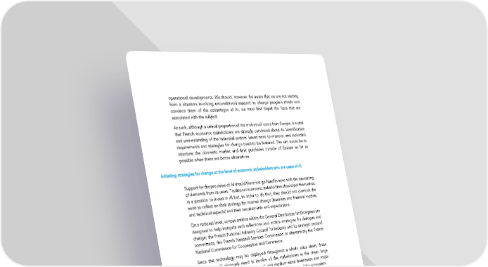operational developments. We should, however, be aware that we are not starting from a situation involving unconditional support: to change people’s minds and convince them of the advantages of AI, we must first dispel the fears that are associated with the subject. As such, although a critical proportion of the market will come from Europe, it is vital that French economic stakeholders are strongly convinced about AI. Identification and understanding of the industrial sectors’ issues need to improve, and individual requirements and strategies for change need to be fostered. The aim would be to structure the domestic market and limit purchases outside of Europe as far as possible when there are better alternatives. Initiating strategies for change at the level of economic stakeholders who are users of AI Support for the provision of AI should therefore go hand in hand with the structuring of demands from its users. Traditional economic stakeholders should put themselves in a position to invest in AI but, in order to do that, they should not overlook the need to reflect on their strategy for internal change (business and financial models, and technical aspects) and their requirements and expectations. On a national level, various entities within the General Directorate for Enterprise are designed to help instigate such reflections and initiate strategies for dialogue and change: the French National Advisory Council for Industry and its strategic sectoral committees, the French National Services Commission or alternatively the French National Commission for Cooperation and Commerce. Since this technology may be deployed throughout a whole value chain, these dialogues will obviously need to involve all the stakeholders in the chain: large companies, integrators, start-ups, small and medium-sized businesses and major platforms, without whom they would only have a partial picture of the ecosystem. These reflections need to go hand in hand with training initiatives designed for small and medium-sized businesses; they could be part of the overall scheme for the digitalization of small and medium-sized enterprises—which has, for the most part, been taken on by the regions—in which AI should be a cross-cutting theme. Facilitating dialogue between AI’s stakeholders and regulators Certain sectors need to inform themselves well in advance about the specific regulations relating to the development of AI solutions, such as: the sector-specific regulations which apply to markets and financial stakeholders which fall under the control of the ACPR (Autorité de contrôle prudentiel et de résolution —French Authority for Prudential Supervision and Resolution) or the AMF (Autorité des marchés financiers—French Financial Markets Authority); the regulations concerning the security of information systems which fall under control of the ANSSI (Agence Nationale de la Sécurité des Systèmes d’Information —French National Cybersecurity Agency); and the regulations relating to the use of personal data operated by the CNIL (Commission nationale de l’informatique et des libertés — French Data Protection Authority). Sources of innovations in AI may be faced with uncertainties concerning the compatibility of their business models with the legal framework and the attendant 34
