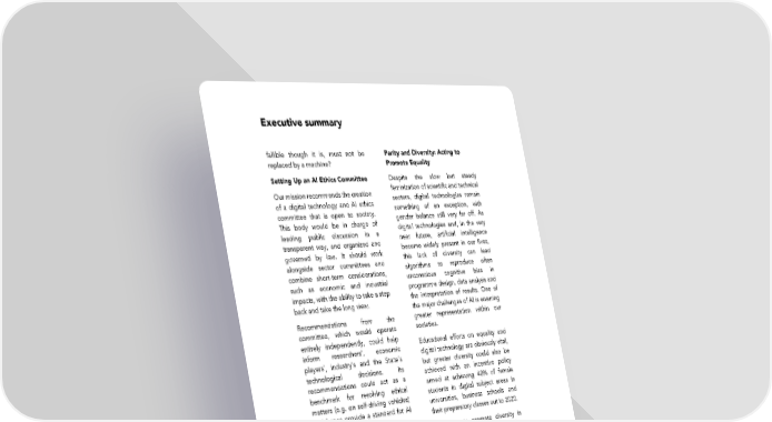 Executive summary fallible though it is, must not be Parity and Diversity: Acting to replaced by a machine? Promote Equality Setting Up an AI Ethics Committee Despite the slow but steady Our mission recommends the creation feminization of scientific and technical of a digital technology and AI ethics sectors, digital technologies remain committee that is open to society. something of an exception, with This body would be in charge of gender balance still very far off. As leading public discussion in a digital technologies and, in the very transparent way, and organized and near future, artificial intelligence governed by law. It should work become widely present in our lives, alongside sector committees and this lack of diversity can lead combine short-term considerations, algorithms to reproduce often such as economic and industrial unconscious cognitive bias in impacts, with the ability to take a step programme design, data analysis and back and take the long view. the interpretation of results. One of the major challenges of AI is ensuring Recommendations from the greater representation within our committee, which would operate societies. entirely independently, could help Educational efforts on equality and inform researchers’, economic digital technology are obviously vital, players’, industry’s and the State’s but greater diversity could also be technological decisions. Its achieved with an incentive policy recommendations could act as a aimed at achieving 40% of female benchmark for resolving ethical students in digital subject areas in matters (e.g. on self-driving vehicles) universities, business schools and and hence provide a standard for AI their preparatory classes out to 2020. developments. All moves to promote diversity in digital companies could be further Part 6 — fostered by a nation-wide approach to promote diversity in technology via a Inclusive and Diverse AI national database aimed at documenting gender inequality in the workplace and the provision of funds Artificial intelligence must not devoted to supporting diversity in AI. become a new way of excluding parts Developing Digital Mediation and of the population. At a time when Social Innovation to Ensure AI these technologies are becoming the Benefits All keys to opening the world of the future, this is a democratic Given the extent of future AI-led requirement. AI creates vast transformation, we have a collective opportunities for value creation and responsibility to ensure that no-one the development of our societies and gets left behind. For everyone to truly individuals, but these opportunities benefit from breakthroughs made in must benefit everyone across the AI, our procedures for access to rights board. must change and our mediation capabilities must also be considerably bolstered. So our mission puts forward a proposal to set up an 16