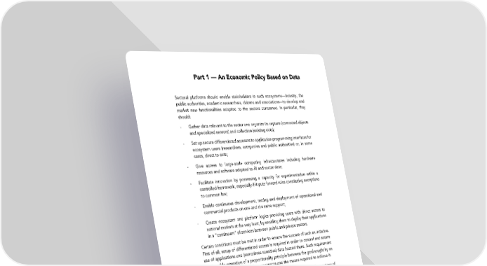 Part 1 — An Economic Policy Based on Data Sectoral platforms should enable stakeholders in such ecosystems—industry, the public authorities, academic researchers, citizens and associations—to develop and market new functionalities adapted to the sectors concerned. In particular, they should: - Gather data relevant to the sector and organize its capture (connected objects and specialized sensors) and collection (existing data); - Set up secure differentiated accesses to application programming interfaces for ecosystem users (researchers, companies and public authorities) or, in some cases, direct to data; - Give access to large-scale computing infrastructures including hardware resources and software adapted to AI and sector data; - Facilitate innovation by possessing a capacity for experimentation within a controlled framework, especially if it puts forward rules constituting exceptions to common law; - Enable continuous development, testing and deployment of operational and commercial products on one and the same support; - Create ecosystem and platform logics providing users with direct access to national markets at the very least, by enabling them to deploy their applications in a “continuum” of services between public and private sectors. Certain conditions must be met in order to ensure the success of such an initiative. First of all, setup of differentiated access is required in order to control and secure use of applications and (sometimes sensitive) data hosted there. Such requirement must enable operation of a proportionality principle between the goal sought by an individual wishing to access these resources and the means required to achieve it. The second condition is that of openness and transparency. As regards questions of technological and economic sovereignty and questions of efficiency and performance alike, it is essential to prioritize use of open technologies (“open source” and “open hardware”) as much as possible, so as not to fall victim to closed- shop mindsets. Public awareness of the platform and the data and resources it contains is a major factor in membership and mobilization of the ecosystem under consideration. The final condition is that sectoral constraints in development of platforms must be taken into account, such as, for example, consent management in the context of personal data management. Apart from the question of compliance, this should finally provide the various interested parties concerned with a pre-approved toolbox, so dispensing with complementary developments they would otherwise have had to consent to. Setting Up Innovation Sandboxes It is essential to simplify the AI innovation pathway, in particular in priority sectors. A common complaint in all these areas is that there are too many regulations and too much time is taken over examination of applications to implement such experiments; the two problems are not unconnected. 47