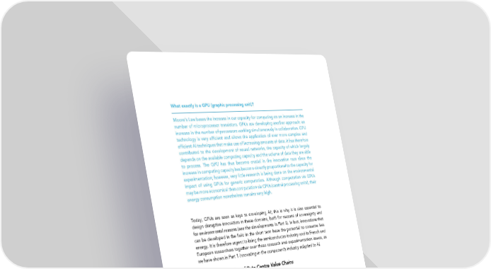 What exactly is a GPU (graphic processing unit)? Moore’s Law bases the increase in our capacity for computing on an increase in the number of microprocessor transistors. GPUs are developing another approach: an increase in the number of processors working simultaneously in collaboration. GPU technology is very efficient and allows the application of ever more complex and efficient AI techniques that make use of increasing amounts of data. It has therefore contributed to the development of neural networks, the capacity of which largely depends on the available computing capacity and the volume of data they are able to process. The GPU has thus become crucial in the innovation race since the increase in computing capacity has become directly proportional to the capacity for experimentation; however, very little research is being done on the environmental impact of using GPUs for generic computation. Although computation via GPUs may be more economical than computation via CPUs (central processing units), their energy consumption nonetheless remains very high. Today, GPUs are seen as keys to developing AI; this is why it is also essential to design disruptive innovation in these domains, both for reasons of sovereignty and for environmental reasons (see the developments in Part 1). In fact, innovations that can be developed in the field in the short term have the potential to consume less energy. It is therefore urgent to bring the semiconductor industry and its French and European researchers together over these research and experimentation issues, as we have shown in Part 1 Innovating in the components industry adapted to AI. Taking Action in the Greening of Data Centre Value Chains Through the development of the Digital Single It is essential that we Market, it is essential that we support the European cloud industry in its ecological transition, in order to support the European keep greening the AI value chain. Certain stakeholders cloud industry in its are already exemplary in terms of their energy efficiency and it is important to circulate these good ecological transition practices throughout the sector. In addition, AI can make a valuable contribution to this greening process. In 2016, Deepmind optimized energy consumption in its data and cooling system centers thanks to machine learning, thus increasing energy efficiency in its data centers by 15%. Supporting Ecological Moves on the Part of European Cloud Providers Creating a label and encouraging the use of ecological cloud providers by local authorities and the State This support could take the form of creating a label which could be managed by the Ministry for the Ecological and Inclusive Transition in conjunction with the Minister of State for the Digital Sector and it could be linked to the implementation of tax 106