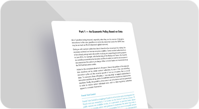 Part 1 — An Economic Policy Based on Data risk of penalties being imposed, especially when they are the sources of disruptive innovations: in this case, penalties are extremely substantial (under the GDPR, fines may be as much as 4% of a business’s global turnover). Dialogue with sectoral authorities should therefore be encouraged by making the necessary technical and human resources available. Certain sectoral authorities have in fact already set up teams devoted to studying and supporting innovative projects: in June 2016, for example, with the backing of the Banque de France, the Autorité de contrôle prudentiel et de résolution and the Autorité de contrôle des banques et des assurances (the authority in charge of the control of banks and insurance) set up the FinTech Innovation center. Added to the complaints about lack of support, there is the problem of the response time deadlines set by certain sectoral authorities. In view of the ever-dwindling innovation cycles and the uncertain growth of start-up companies, this is a crucial issue. To overcome these difficulties, a ‘one-stop shop’ to support stakeholders in innovation could be set up, and a 3-month limit could be imposed on response time deadlines. Finally, the possibility of recourse to an ombudsman could be guaranteed in order to resolve certain individual cases, such as when regulatory authorities appear to contradict themselves. French Tech Central French Tech Central is a stopping-off point for information and a meeting place for French start-ups everywhere; it is located on the Station F start-up campus. 30 public services are available on-site, on a permanent or part-time basis, whose mission is to provide advice and guidance to businesses; the latter may make a request for a private meeting with a representative from one or more public services via a special online platform or attend information workshops run by administrations specializing in the problems encountered by start-ups. The proximity of these administrations to the start-up ecosystem is intended to allow the testing of new deals from public services. For these trials constitute the initial stages of a project which is designed to involve the whole country, and in particular the 13 French Tech Cities, as of the first half of 2018. Assisting in the development of stakeholders capable of delivering AI solutions for industry AI solutions are the equivalent of one unique component destined to be incorporated into much more complex systems. These systems may be difficult to comprehend, especially for small organizations which are attempting to enter European or even global markets. Two scenarios present themselves: either a business is by its very nature in a position to go one step further and target the French, European and world markets directly, with the capacity to stand alone; or this is not the case and it needs to join a large group of other businesses in the role of a ‘building block’. This second scenario requires industrial ‘building block’ integrators capable of supplying the various specialist markets with their specific demands. The diversity of the European industrial AI landscape has prompted this observation: the only way to exist across a fairly large section of business verticals 35
