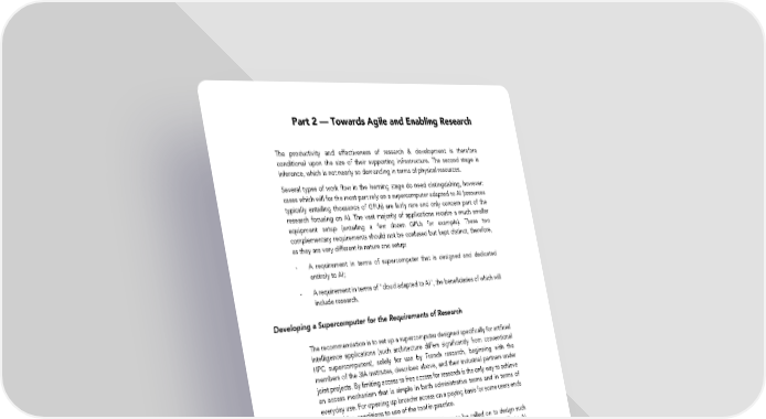 Part 2 — Towards Agile and Enabling Research The productivity and effectiveness of research & development is therefore conditional upon the size of their supporting infrastructure. The second stage is inference, which is not nearly so demanding in terms of physical resources. Several types of work flow in the learning stage do need distinguishing, however: cases which will for the most part rely on a supercomputer adapted to AI (resources typically entailing thousands of GPUs) are fairly rare and only concern part of the research focusing on AI. The vast majority of applications require a much smaller equipment setup (entailing a few dozen GPUs for example). These two complementary requirements should not be confused but kept distinct, therefore, as they are very different in nature and setup: - A requirement in terms of supercomputer that is designed and dedicated entirely to AI; - A requirement in terms of "cloud adapted to AI", the beneficiaries of which will include research. Developing a Supercomputer for the Requirements of Research The recommendation is to set up a supercomputer designed specifically for artificial intelligence applications (such architecture differs significantly from conventional HPC supercomputers), solely for use by French research, beginning with the members of the 3IA institutes, described above, and their industrial partners under joint projects. By limiting access to free access for research is the only way to achieve an access mechanism that is simple in both administrative terms and in terms of everyday use. For opening up broader access on a paying basis for some users ends up attaching conditions to use of the tool in practice. Private businesses specializing in the field will have to be called on to design such infrastructure and specifications will have to be drawn up that are specific to AI. Moreover, technical management of the infrastructure may be delegated to an organization like the Key National Infrastructure for Supercomputing (GENCI). This already taps into a range of necessary skills for this purpose (engineers, administrators and so on). These will nevertheless need extending to the specifics of AI (which, and if we might stress this point, are not the same as those of the traditional HPC), so as to be able to integrate the constantly upgraded high- performance equipment, software stacks updated with the latest algorithmic advances and data storage capacities for guaranteeing secure access (modelled, for example, on Teralab) so that the national private partners feel confident entrusting it with their data for research purposes. Note that this recommendation is fairly similar to the one outlined by the working group of the alliance Allistène for a HPDA infrastructure dubbed GENIAL (which stands for Key National Infrastructure for Artificial Intelligence), the key points of which we will be able to set out again word for word, not least as regards the importance of guaranteeing the most flexible type of access possible, and the mechanism proposed for achieving this, of an open-access section with ex-post checks and another section where access is reserved. 75