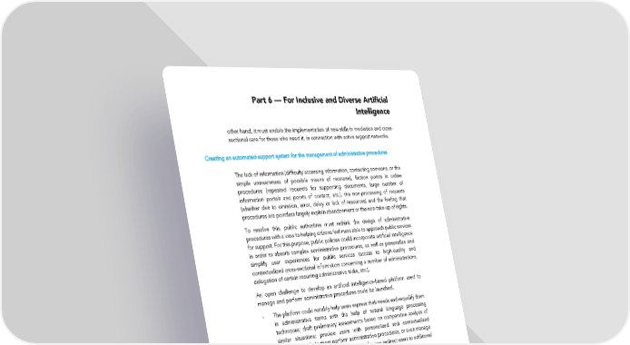 Part 6 — For Inclusive and Diverse Artificial Intelligence other hand, it must enable the implementation of new skills in mediation and cross- sectional care for those who need it, in connection with active support networks. Creating an automated support system for the management of administrative procedures The lack of information (difficulty accessing information, contacting someone, or the simple unawareness of possible means of recourse), friction points in online procedures (repeated requests for supporting documents, large number of information portals and points of contact, etc.), the non-processing of requests (whether due to omission, error, delay or lack of resources) and the feeling that procedures are pointless largely explain abandonment or the non-take-up of rights. To resolve this, public authorities must rethink the design of administrative procedures with a view to helping citizens feel more able to approach public services for support. For this purpose, public policies could incorporate artificial intelligence in order to absorb complex administrative procedures, as well as personalize and simplify user experiences for public services (access to high-quality and contextualized cross-sectional information concerning a number of administrations, delegation of certain recurring administrative tasks, etc.). An open challenge to develop an artificial intelligence-based platform used to manage and perform administrative procedures could be launched. - The platform could notably help users express their needs and requalify them in administrative terms with the help of natural language processing techniques; draft preliminary assessments based on comparative analysis of similar situations; provide users with personalized and contextualized information to help them perform administrative procedures, or even manage the completion of certain administrative tasks; and redirect users to additional online support or expert help. - As a first step, the platform could focus on the most simple and recurring administrative procedures; those that are most sought out by users (number of cases) and those that have the highest rates of abandonment or non- recourse of rights (Inland Revenue for tax collection - 12%, the CPAM [caisse primaire d’assurance maladie—public health insurance body] - 8%, the CAF [Caisse d’allocation familiale—Social security office] - 4%, followed by the prefecture [4%] for the allocation of residence permits for foreign nationals, management of commercial and private vehicles and driving licences, identification and registration of associations, and the coordination of demonstrations); - The platform’s architecture and operation should be imperatively focused on user experience: using UX Design experts, coordinating user journey testing, incorporating support from actors in mediation, etc. The aim is to take better account of friction points encountered by users and to resolve them by incorporating more intuitive design of both the interface and interactions. 143