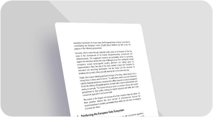 standards of protection. In recent years, the European Union has been committed to consolidating the European market (Digital Single Market) and that is also the purpose of the following propositions. Secondly, efforts made through industrial policy need to be focused on four key areas in the development of AI: health, transport/mobility, environment and defense/security. The suggested measures are particularly aimed at structuring support for innovation around the major challenges of our time, uniting the various ecosystems around sector-specific pooling platforms and making space for experimentation. Here, the role of the State consists in laying the foundation for innovation and providing stakeholders with the means and the resources for breaking new ground, without actually steering the movement in any way. Finally, this is about initiating profound changes in the State, which needs to be a driving force in these transformations. The authorities need to provide themselves with the financial and human resources that will be required in order to incorporate AI into the delivery of its public policies, as much with a view to modernization as to setting an example. This implies making progress in a number of areas, from public procurement to State policy relating to human resources and skills; but it also concerns its approach to innovation itself. This section is the longest, not because it is more important than the others—all these priorities deserve the same amount of attention!—but because the recommendations it contains, particularly those which deal with data, are designed to bolster the others. 1. Reinforcing the European Data Ecosystem The techniques of machine learning signal a break with conventional algorithms, especially because they mark the gradual transition from a programming approach to one that involves learning. This is what led the magazine Wired to predict ‘the end of the code’ in June 2016; in the future, we will no longer programme computers, we will train them instead. The functioning of a machine learning algorithm can be compared to the cognitive development of a child who learns by observing the world around him, by analyzing the way in which individuals interact and by reproducing implicit nonverbal rules. Roughly speaking, machine learning follows the same pattern: algorithms are now trained to learn by themselves without actually being programmed. Rather than programming a car so that it can drive by itself, the manufacturers will for example present it with an infinite number of driving scenarios so that it will be able to take action even in the most unlikely situations5. Data clearly forms the basis for this type of learning. Even though machine learning is not the only expression of artificial intelligence (far from it), it is currently the one which is both the most used, the fastest developing and the most subject to global competition. 5. “At our test site in California, people throw themselves down flat in front of the cars and then curl themselves into a ball”: Chris Urmson, director of the division Google Car (https://www.lesechos.fr/14/03/2016/lesechos.fr/021765692246_comment-la-google-car- utilise-le—deep-learning–.htm) 20