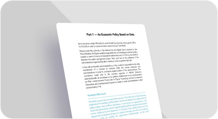 Part 1 — An Economic Policy Based on Data be to nominate a High Officer for AI, as the British have done by setting up the Office for AI (OAI) in a bid to implement their recent strategy25 (see inset). Placed under the authority of the Minister for the Digital Sector (attached to the Prime Minister), this figure would be responsible for coordinating government policy, notably in terms of internal ministerial transformation and for forming the interface between the public and private sectors. They could call on the assistance of the administrations supervised by their ministry in order to perform this task. In line with profoundly interministerial logic, they would be responsible for the daily coordination of a network of contacts within the various ministries and administrations in order to accelerate implementation of the transformations. This coordinator could refer to the technical expertise of DINSIC (Direction interministérielle du numérique et du système d’information et de communication de l’État —Interministerial Directorate for Digital Technology and the Government Information and Communication System) in order to assist administrations in their understanding of AI. The British Office for AI The British government announced the creation of the Office for AI (OAI) following publication of its strategy last November. Its role is to initiate the transformation of public policies using artificial intelligence, to encourage the appropriation of AI tools in the private sector, and to forge strong links with the economic and academic worlds. Jointly led by the Department for Digital, Culture, Media & Sport and the Department for Business, Energy and Industrial Strategy, the OAI and its director are responsible for leading the operational implementation of the UK’s transformation strategy. Creating a Joint Centre of Excellence for AI at State Level Not all administrations possess the same level of maturity in terms of reflecting on the usage of AI in their specialist areas and their implementation processes. A major difficulty resides in the capacity to source the right skills for keeping up with the pace of innovation, identifying their applicability, and potentially transforming them into an initial proof of concept. In this context, public authorities must rely on an organization whose mission is both to recruit profiles adapted to AI transformations and to act as an advisor and a lab for public policy design. This is a temporary arrangement only: over time, these skills should exist and be sustainable within the various administrations, which should be able to recruit specialists in AI from their own sectors. DINSIC seems best placed to take on this role. With its directorate operating under supervision of the Prime Minister, DINSIC is currently responsible for coordinating the activities of administrations in terms of information systems. 25. Document available at the following address: https://www.gov.uk/government/uploads/system/uploads/attachment_data/file/664563/industrial- strategy-white-paper-web-ready-version.pdf 55
