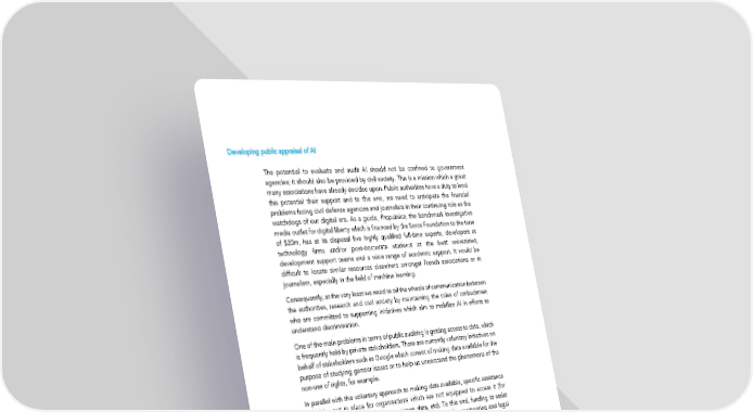 Developing public appraisal of AI The potential to evaluate and audit AI should not be confined to government agencies; it should also be provided by civil society. This is a mission which a great many associations have already decided upon. Public authorities have a duty to lend this potential their support and to this end, we need to anticipate the financial problems facing civil defense agencies and journalists in their continuing role as the watchdogs of our digital era. As a guide, Propublica, the benchmark investigative media outlet for digital liberty which is financed by the Soros Foundation to the tune of $20m, has at its disposal five highly qualified full-time experts, developers at technology firms and/or post-doctorate students at the best universities, development support teams and a wide range of academic support. It would be difficult to locate similar resources elsewhere amongst French associations or in journalism, especially in the field of machine learning. Consequently, at the very least we need to oil the wheels of communication between the authorities, research and civil society by maintaining the roles of ombudsmen who are committed to supporting initiatives which aim to mobilize AI in efforts to understand discrimination. One of the main problems in terms of public auditing is getting access to data, which is frequently held by private stakeholders. There are currently voluntary initiatives on behalf of stakeholders such as Google which consist of making data available for the purpose of studying gender issues or to help us understand the phenomena of the non-use of rights, for example. In parallel with this voluntary approach to making data available, specific assistance could be put in place for organisations which are not equipped to access it (for example, in terms of their ability to secure data, etc). To this end, funding to assist with the accommodation and boosting of projects (scientific, engineering and legal support, etc.) could be considered, under the auspices of an organization whose independence is guaranteed. In this connection, the efforts of the organisations Team Up Turn, Propublica and the Electronic Frontier Foundation in the United States could serve as examples. In addition to assistance in terms of access to data, support for testing procedures and reverse-engineering could be introduced. These auditing procedures should not be the preserve of public auditors. To support public auditing, incentives could be offered to the public for making data available for research purposes and to associations who are actively defending social rights and freedoms, in order to help create different profiles and pathways of users, etc. Using the asset of citizens’ portability (see Part 1 of this report) could be one of the best ways to achieve this. Supporting Research into Accountability In the digital sphere, the most significant scientific progress often results from close collaboration between public authorities, research laboratories and manufacturers; AI is no exception. 118