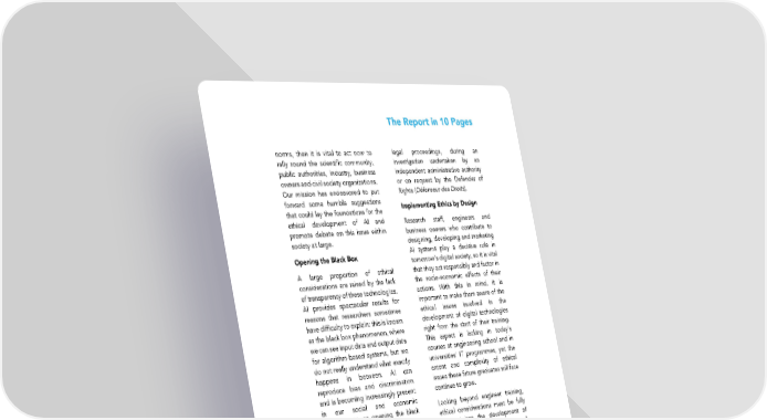 The Report in 10 Pages norms, then it is vital to act now to legal proceedings, during an rally round the scientific community, investigation undertaken by an public authorities, industry, business independent administrative authority owners and civil society organizations. or on request by the Defender of Our mission has endeavored to put Rights (Défenseur des Droits). forward some humble suggestions Implementing Ethics by Design that could lay the foundations for the ethical development of AI and Research staff, engineers and promote debate on this issue within business owners who contribute to society at large. designing, developing and marketing Opening the Black Box AI systems play a decisive role in tomorrow’s digital society, so it is vital A large proportion of ethical that they act responsibly and factor in considerations are raised by the lack the socio-economic effects of their of transparency of these technologies. actions. With this in mind, it is AI provides spectacular results for important to make them aware of the reasons that researchers sometimes ethical issues involved in the have difficulty to explain: this is known development of digital technologies as the black box phenomenon, where right from the start of their training. we can see input data and output data This aspect is lacking in today’s for algorithm-based systems, but we courses at engineering school and in do not really understand what exactly universities’ IT programmes, yet the happens in between. AI can extent and complexity of ethical reproduce bias and discrimination issues these future graduates will face and is becoming increasingly present continue to grow. in our social and economic Looking beyond engineer training, environments, so opening the black ethical considerations must be fully box is a key democratic issue. factored into the development of Explaining machine-learning artificial intelligence algorithms. A algorithms has become a very urgent discrimination impact assessment matter and is now actually a separate could be introduced, similar to the field of research, which must be privacy impact assessments already supported by public authorities. made compulsory by General Data Three areas in particular require an Protection Regulation for some data extra focus: obviously the production processing. The overarching aim here of more explicable models, but also is very simple: have AI developers the production of more intelligible consider the right questions at the user interfaces and an understanding right time. of the cognitive mechanisms used to More broadly speaking, the produce a satisfactory explanation. increasing use of AI in some sensitive Transparency is clearly key, but areas such as policing, banking, looking beyond this issue, it is also insurance, the courts and in Defense vital to facilitate audits of AI systems. (with the question of autonomous This could involve the creation of a weapons) raises a real society-wide group of certified public experts who debate and implies an analysis of the can conduct audits of algorithms and issue of human responsibility. We databases and carry out testing using must also consider the role of any methods required. These experts automation in human decisions: are could be called on in the event of there areas where human judgement, 15