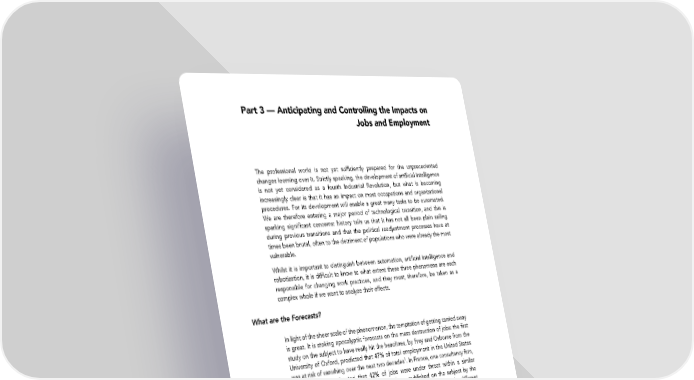 Part 3 — Anticipating and Controlling the Impacts on Jobs and Employment The professional world is not yet sufficiently prepared for the unprecedented changes looming over it. Strictly speaking, the development of artificial intelligence is not yet considered as a fourth Industrial Revolution, but what is becoming increasingly clear is that it has an impact on most occupations and organizational procedures. For its development will enable a great many tasks to be automated. We are therefore entering a major period of technological transition, and this is sparking significant concerns: history tells us that it has not all been plain sailing during previous transitions and that the political readjustment processes have at times been brutal, often to the detriment of populations who were already the most vulnerable. Whilst it is important to distinguish between automation, artificial intelligence and robotization, it is difficult to know to what extent these three phenomena are each responsible for changing work practices, and they must, therefore, be taken as a complex whole if we want to analyze their effects. What are the Forecasts? In light of the sheer scale of the phenomenon, the temptation of getting carried away is great. It is stoking apocalyptic forecasts on the mass destruction of jobs: the first study on the subject to have really hit the headlines, by Frey and Osborne from the University of Oxford, predicted that 47% of total employment in the United States 1 was at risk of vanishing over the next two decades . In France, one consultancy firm, Roland Berger, estimated that 42% of jobs were under threat within a similar timeframe. The most recent study to have been published on the subject by the Employment Advisory Council, attached to the Prime Minister, adopted a different approach and predicted that 10% of jobs were at risk of disappearing, but that 50% of jobs would potentially be automated at more than The professional world 50%. The bottom line is that the scale of change we is not yet sufficiently are talking about here is far-reaching and must be prepared for the matched by collective planning. unprecedented changes And there are several ways we could plan in light of looming over it these forecasts. First, it may be tempting to deny that there is a problem, maintaining that new jobs we know nothing about yet will be created in high numbers and that, owing to the interplay of prices and demand, individuals will naturally move into new roles. But we now know that things are not so simple, that the human and social costs are often very high during economic transitions and that the simple pressures of the market are seldom enough to distribute the supply of work in the best way possible. The risks of higher unemployment and inequality may be high. On the other hand, we could choose to adopt a gloom-mongering approach, often for the sake of better defending hidden interests: when it looks like disaster is all but upon us, it is easy to forget certain principles which have until now 1. Future of Employment, C. Frey and M. Osborne, Oxford. 81