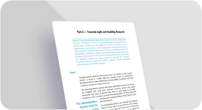 Part 2 — Towards Agile and Enabling Research industry to access the research programmes and departments bearing on their areas of interest. The affiliated members can also attend working meetings and seminars, receive copies of reports and other publications and have facilitated access to students whom they may invite to come and present their work in internal seminars, with the prospect of perhaps being recruited. They are also privileged partners with the possibility of submitting collaborative project proposals to various national and European calls, and benefit from facilities for setting up joint research centers with the University's departments. These programmes transcend the traditional boundaries between academia and industry, resulting in win-win relationships against a backdrop of scientific excellence. Support Underpinning the appeal and effectiveness of the 3IA institutes are three support strands: 1) access to virtually unlimited computing means; 2) administrative procedures that have been streamlined as far as possible; 3) assistance with living conditions, not least for foreign researchers. The computing strand is essential: the private stakeholders involved in AI research are equipped with vastly more advanced computing facilities than public laboratories and access to platform data which are quite simply out of public researchers' reach, on evident grounds of industrial property. The 3IA institutes will The administrative offer dedicated computing facilities, with pooling of an open burden must be data set (proposal). The administrative strand is also essential: any researcher eased drawn to France, only to be put off by the overly complex red tape and response times, will be a source of lasting bad publicity for our entire system. The administrative burden must be eased. The facilities enabled by not-for-profit associations or foundations, for example, must become the rule within the 3IA institutes—particularly when it comes to recruitment and purchasing. The civil service pay scales are dissuasive, a point we hope to have made clear, in light of two facts: 1) productivity varies by several orders of magnitude between researchers in this field; 2) there are numerous competitors who are able to pay high salaries after a short decision-making process. Aside from recruitment, in terms of purchases and assignments, the burden of proof must be reversed, by systematically authorizing purchases by purchasing cards, and by conducting ex post checks on assignments. Lastly, offering foreigners assistance with their arrival is essential for hosting not only researchers, but also students, who may be non-French speakers: residence permits and contact with the Prefecture; assistance with housing; helping the other spouse to find a job; help with finding school places for children; cultural help. Similar forms of support must also be offered in the event of mobility in France. Setting Up a National Coordination Strategy The 3IA institutes will be expected to nurture close, robust relations between them, both in scientific and organizational terms. 71