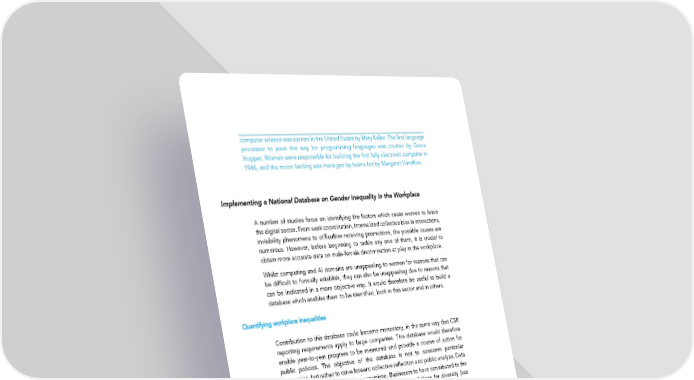 computer science was earned in the United States by Mary Keller. The first language processor to pave the way for programming languages was created by Grace Hopper. Women were responsible for building the first fully electronic computer in 1946, and the moon landing was managed by teams led by Margaret Hamilton. Implementing a National Database on Gender Inequality in the Workplace A number of studies focus on identifying the factors which cause women to leave the digital sector. From work coordination, internalized collective bias in interactions, invisibility phenomena to difficulties receiving promotions, the possible causes are numerous. However, before beginning to tackle any one of them, it is crucial to obtain more accurate data on male-female discrimination at play in the workplace. Whilst computing and AI domains are unappealing to women for reasons that can be difficult to formally establish, they can also be unappealing due to reasons that can be indicated in a more objective way. It would therefore be useful to build a database which enables them to be identified, both in this sector and in others. Quantifying workplace inequalities Contribution to this database could become mandatory, in the same way that CSR reporting requirements apply to large companies. This database would therefore enable year-to-year progress to be measured and provide a course of action for public policies. The objective of the database is not to condemn particular companies, but rather to drive forward collective reflection and public analysis. Data made public would therefore be anonymized. Businesses to have contributed to the database could promote this fact and highlight their ambitions for diversity (see inset). The database should also be fed by public authorities in order to foster its exemplarity in the field. The database should also be demanding when it comes to selecting indicators: - gender balance rate in executive committees and board of directors; - gender balance rate in teams; - gender balance rate in appointments, promotions and recruitment; - gender balance rate in terms of grade and job type; - pay gap between different jobs, at different grades; - entrepreneurial support and the establishment of women’s networks. indicators produced by French union Syntec Numérique on the feminization Founded in July 2011, the programme ‘Femmes du Numérique’ (Women of Digital Technology) launched by Syntec Numérique aims to promote gender equality within the digital ecosystem and highlight the benefits of a career in the sector to young girls. To this effect, digital technology has established benchmark indicators in order to monitor efforts accomplished within the digital sector in view to promoting gender equality in the workplace. This survey could therefore provide elements within the framework of the national database proposed. 140