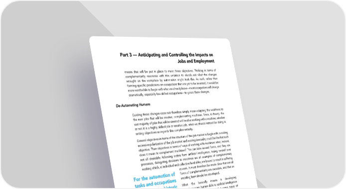 Part 3 — Anticipating and Controlling the Impacts on Jobs and Employment means that will be put in place to meet these objectives. Thinking in terms of complementarity resonates with this ambition to sketch out what the changes wrought on the workplace by automation might look like. As such, rather than forming specific predictions on occupations that are yet to be invented, it would be more worthwhile to begin with what we already know—most occupations will change dramatically, especially low-skilled occupations—to guide these changes. De-Automating Humans Guiding these changes does not therefore simply mean adapting the workforce to the new jobs that will be created, complementing machines. Since, in theory, the vast majority of jobs that will be created will involve working with a machine, whether or not it is a highly skilled job or creative job, what we should instead be doing is setting objectives as regards this complementarity. General objectives in terms of the structure of the job market to begin with: avoiding excessive polarization of the job market and soaring inequality could be the first such objective. Then objectives in terms of ways of working with machines: what, indeed, does it mean to complement machines? This can take several forms, and they are not all desirable: following orders from artificial intelligence, losing control over processes, delegating decisions to machines are all examples of complementary working which, at individual and collective level alike, are bound to result in suffering at work. It must therefore be made clear that not all For the automation of forms of complementarity are desirable, and that an tasks and occupations enabling form should be developed. could represent a historic What this basically means is developing opportunity for de- complementary human skills to artificial intelligence on a massive scale; the fact that some types of automating human work complementarity destroy human abilities must be underscored, and we need to realize that we must work together to set the scene for developing a form of complementarity where human abilities can be enhanced. For the automation of tasks and occupations could represent a historic opportunity for de-automating human work: it enables us to hone our uniquely human skills (creativity, manual dexterity, abstract thinking, problem-solving). We must turn artificial intelligence to our advantage to develop the abilities of each and every one of us: the opportunity is there for the taking. Preparing for the Transition Setting political objectives must go hand-in-hand with scaling up our abilities to predict and understand the phenomena at work. For whilst it may be possible to estimate the major macroeconomic effects that the introduction of AI technologies will trigger, it goes without saying that much remains uncertain, that the lines are moving constantly and that the forecasts constantly need clarifying. If we are to address the problem head-on, we therefore need to begin by fine-tuning our understanding of these phenomena: we have to find ways of more clearly grasping what is happening, of maintaining our abilities to look ahead over time and of 85
