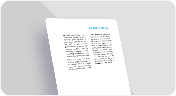 The Report in 10 Pages automated system to help manage number of companies. Setting aside administrative formalities, aimed at healthcare, social fields receive only a improving public awareness of tiny portion of private investment. administrative regulations and how This set-up for the AI-led innovation they apply to each individual’s ecosystem has consequences on the personal situation. In addition, fresh speed of progress made in social mediation capabilities must be matters. In order to redistribute these developed to support those who innovation capabilities, public require help, in cooperation with care authorities could embark on specific networks already present nation-wide. programmes to support AI innovation Lastly, it is crucial that public in the social arena and provide the authorities support the development necessary systems for the various of AI-based initiatives in the social parties in the sector so that they can arena. AI-led innovation capabilities benefit from AI-related progress. remain very focused within a small 17
