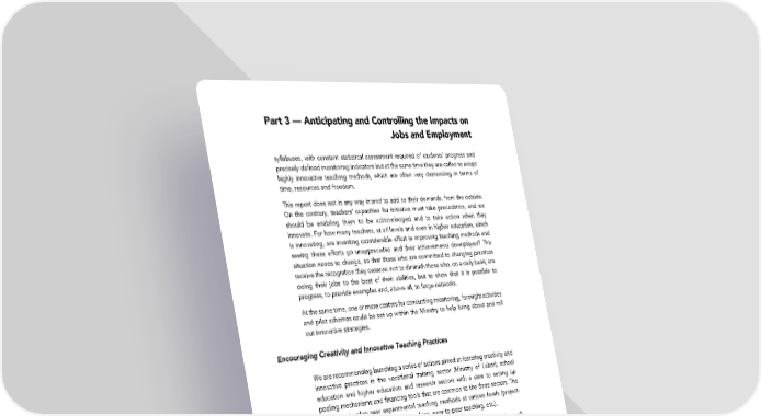 Part 3 — Anticipating and Controlling the Impacts on Jobs and Employment syllabuses, with constant statistical assessment required of students' progress and precisely defined monitoring indicators but at the same time they are called to adopt highly innovative teaching methods, which are often very demanding in terms of time, resources and freedom. This report does not in any way intend to add to their demands, from the outside. On the contrary, teachers' capacities for initiative must take precedence, and we should be enabling them to be acknowledged and to take action when they innovate. For how many teachers, at all levels and even in higher education, which is innovating, are investing considerable effort in improving teaching methods and seeing these efforts go unappreciated and their achievements downplayed? This situation needs to change, so that those who are committed to changing practices receive the recognition they deserve: not to diminish those who, on a daily basis, are doing their jobs to the best of their abilities, but to show that it is possible to progress, to provide examples and, above all, to forge networks. At the same time, one or more centers for conducting monitoring, foresight activities and pilot schemes could be set up within the Ministry to help bring about and roll out innovative strategies. Encouraging Creativity and Innovative Teaching Practices We are recommending launching a series of actions aimed at fostering creativity and innovative practices in the vocational training sector (Ministry of Labor), school education and higher education and research sectors with a view to setting up pooling mechanisms and financing tools that are common to the three sectors. The aim is to develop new experimental teaching methods at various levels (project- based teaching, cross-disciplinary teaching, peer-to-peer teaching, etc.). Such measures are not intended to create new demands on teachers but, above all, to raise the profile and bring together in a network those who are busy setting up innovative teaching practices. They will also seek to equip these pioneers and enable them to take action, not unlike what is being done for general interest entrepreneurs, by giving precedence to collective setups. Priority must be given to revising teacher training ahead of any specific measure. In addition, innovations to the extracurricular system must be promoted and harnessed by the traditional education system: countless initiatives encourage creativity and innovation, among them competitions (French young mathematicians' tournament), educational support initiatives (Curious Mind) and local pilot schemes. The number one objective is to raise the profile and bring together in a network all those who are breaking new ground in their creativity-enhancing teaching practices. Setting Up a Platform for Promoting Pioneers of Innovative Teaching Methods This could be somewhere for: - accommodating a library of innovative teaching practices, with an explanation for each practice and the rules for putting them in place; 95