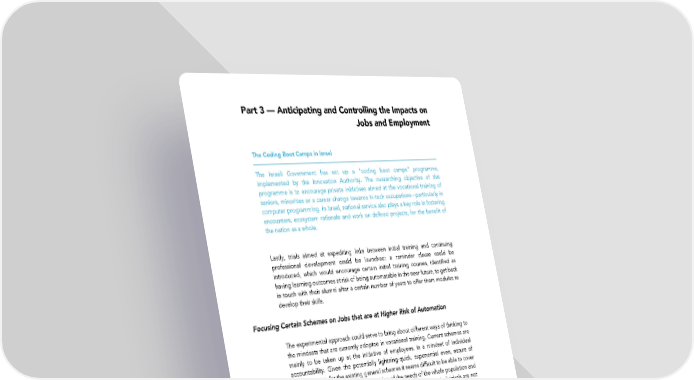 Part 3 — Anticipating and Controlling the Impacts on Jobs and Employment The Coding Boot Camps in Israel The Israeli Government has set up a "coding boot camps" programme, implemented by the Innovation Authority. The overarching objective of this programme is to encourage private initiatives aimed at the vocational training of seniors, minorities or a career change towards hi-tech occupations—particularly in computer programming. In Israel, national service also plays a key role in fostering encounters, ecosystem rationale and work on defined projects, for the benefit of the nation as a whole. Lastly, trials aimed at expediting links between initial training and continuing professional development could be launched: a reminder clause could be introduced, which would encourage certain initial training courses, identified as having learning outcomes at risk of being automatable in the near future, to get back in touch with their alumni after a certain number of years to offer them modules to develop their skills. Focusing Certain Schemes on Jobs that are at Higher Risk of Automation The experimental approach could serve to bring about different ways of thinking to the mindsets that are currently adopted in vocational training. Current schemes are mainly to be taken up at the initiative of employees, in a mindset of individual accountability. Given the potentially lightning-quick, exponential even, nature of these changes, for the existing general schemes it seems difficult to be able to cover all situations, enabling both consideration of the needs of the whole population and the need to act in a targeted and urgent manner. What is more, individuals are not all equally equipped in the face of their changing jobs to be able to adapt and build alternative career paths. In this regard, trials could be carried out to develop schemes for specific target groups, whose jobs are considered to be at the highest risk of automation and who will struggle to make the necessary career changes themselves. The aim is therefore to move partly away from the sole view that individuals are accountable for their own professional transitions. Accordingly, a trial could be conducted to transform the career review guidance (CEP) or to come up with a new type of individual training leave. Examples of trials The CEP: the resources of the career review guidance (CEP) could be proactively geared towards the individuals working in these occupations, without waiting for them to initiate the process themselves. This free, personalized support scheme, available to anyone wishing to review their professional situation, is a key feature of the vocational reform, and yet it remains vastly underused today. Indeed, to work effectively, mechanisms that make individuals accountable for their own training choices, via the individual training account, are reliant on the latter's abilities to 89