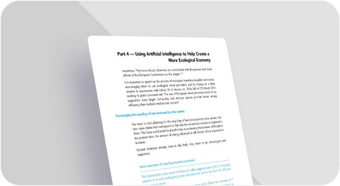 Part 4 — Using Artificial Intelligence to Help Create a More Ecological Economy incentives. This move should, however, be coordinated with the present and future efforts of the European Commission on this subject. 4 It is important to speed up the process of ecological transition in public services by encouraging them to use ecological cloud providers, and by relying on a label created in accordance with Article 10 of decree no. 2016-360 of 25 March 2016 relating to public procurement. The use of European cloud providers needs to be supported since larger computing and storage spaces provide better energy efficiency than multiple smaller data centers5. Encouraging the recycling of heat produced by data centers We need to start planning for the recycling of heat produced by data centers, the new value chains that correspond to this and the investment needed to implement them. The State could assist local authorities in addressing these issues. Although at the present time, the amount of energy obtained is still limited, this is expected to increase. Several initiatives already exist in this field; they need to be encouraged and supported. Some examples of recycling the heat produced The Natixis bank’s data center in Marne-La-Vallée supplies water at 55 °C to heating systems in an area undergoing urban development and to the local Val d’Europe water sports center. The Stimergie company has developed a system which allows the recovery of 1 MWh of heat per server per year, which represents 60% of the heat generated, i.e. the servers’ energy consumption is reduced by more than half. The company has signed several contracts to install this system elsewhere in France, including at a block of 40 flats in Nantes and at the swimming pool at La Butte aux Cailles in the 13th arrondissement (metropolitan district) in Paris. Tapping into open hardware and open software The Open Compute project has shown that the open hardware approach can make significant energy savings possible. Facebook announced that it has saved $2bn in infrastructure costs in 3 years thanks to this project, and that it has gained 38% in energy efficiency and saved up to 24% in operating costs. 4. Following the public consultation on this subject, which was led by the Commission in October 2017, initiatives should be implemented shortly. 5. See the Direction générale des entreprises (General Directorate for Enterprise) Guide to cloud computing and data centers 107