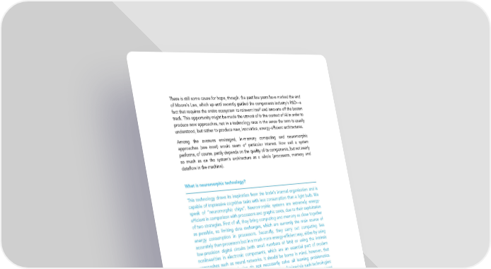There is still some cause for hope, though: the past few years have marked the end of Moore’s Law, which up until recently guided the components industry’s R&D—a fact that requires the entire ecosystem to reinvent itself and innovate off the beaten track. This opportunity might be made the utmost of in the context of AI in order to produce new approaches, not in a technology race in the sense the term is usually understood, but rather to produce new, innovative, energy-efficient architectures. Among the avenues envisaged, in-memory computing and neuromorphic approaches (see inset) would seem of particular interest. How well a system performs, of course, partly depends on the quality of its components, but not nearly so much as on the system’s architecture as a whole (processors, memory and dataflow in the machine). What is neuromorphic technology? This technology draws its inspiration from the brain’s internal organization and is capable of impressive cognitive tasks with less consumption than a light bulb. We speak of “neuromorphic chips”. Neuromorphic systems are extremely energy- efficient in comparison with processors and graphic cards, due to their exploitation of two strategies. First of all, they bring computing and memory as close together as possible, so limiting data exchanges, which are currently the main source of energy consumption in processors. Secondly, they carry out computing less accurately than processors but in a much more energy-efficient way, either by using low-precision digital circuits (with small numbers of bits) or using the intrinsic nonlinearities in electronic components, which are an essential part of modern approaches such as neural networks. It should be borne in mind, however, that neuromorphic technologies do not necessarily solve all learning problematics. Several articles have tried to quantify energy gains obtained via such technologies: IBM’s TrueNorth neuromorphic chip, for example, consumes 20 mW/cm2 compared with 100 W/cm2 for conventional computers, for implementation of neural networks. Learning is carried out offline, however. Online learning via these technologies remains a challenge our researchers have yet to resolve, and could therefore be the subject of an innovation challenge. Source: The Centre for Nanoscience and Technology’s contribution to the mission. As well as provision of general support to the semiconductor industry, it might well be necessary to organize another innovation challenge bearing on construction of a supercomputer, for example, or embedded means of computing adapted to AI and only requiring European technologies. The aim of such a challenge would be to come up with new architectures taking advantage of European technological innovations—in the fields of in-memory computing or neuromorphics, for example. Such a challenge could well further the development of the transport sector at European level, especially in the event of setup of a European Agency for Disruptive Innovation. 52