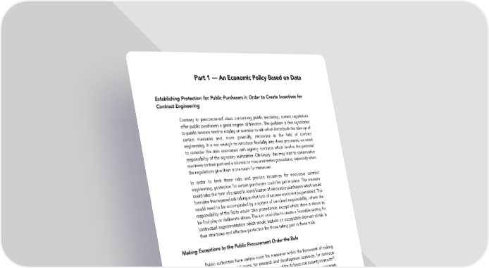 Part 1 — An Economic Policy Based on Data Establishing Protection for Public Purchasers in Order to Create Incentives for Contract Engineering Contrary to preconceived ideas concerning public tendering, current regulations offer public purchasers a great degree of freedom. The problem is that signatories to public tenders tend to display an aversion to risk which limits both the take-up of certain measures and, more generally, innovation in the field of contract engineering. It is not enough to introduce flexibility into these processes; we need to consider the risks associated with signing contracts which involve the personal responsibility of the signatory authorities. Obviously, this may lead to conservative reactions on their part and a reliance on tried and tested procedures, especially when the regulations give them more room for maneuver. In order to limit these risks and provide incentives for innovative contract engineering, protection for certain purchasers could be put in place. This measure could take the form of a specific identification of innovative purchasers which would formalize the required risk-taking so that lack of success would not be penalized. This would need to be accompanied by a system of devolved responsibility, where the responsibility of the State would take precedence, except where there is shown to be foul play or deliberate abuse. The aim would be to create a favorable setting for contractual experimentation which would include an acceptable element of risk in their structures and effective protection for those taking part in these trials. Making Exceptions to the Public Procurement Order the Rule Public authorities have unique room for maneuver within the framework of making exceptions in special cases: for research and development contracts, for contracts which concern the vital interests of the State and for defense and security contracts18. In these circumstances, they may choose to remove the standard constraints contained within conventional rules of procedure in order to exercise European and national preference, for example, or alternatively to award contracts by mutual agreement in accordance with appropriate procedures. On paper, these exceptions give a lot of freedom to the public purchaser. In practice, the public purchaser tends to be very cautious since, in these cases of exception, the conditions of use are not very clearly defined. We need to make these exceptions wherever possible and they need to be accompanied by guides to best practice; this could contribute to safeguarding public purchasers, in particular regarding the exception made for research and development. The exception made concerning the vital interests of the State itself raises specific questions; in particular, it is not always easy to determine precisely which cases are covered. In the field of health, for example, we can easily consider that creating and controlling a repository of data which relates to citizens’ health would come under this exception. In any event, it would appear crucial to define its scope. 18. These are, however, governed by specific decree. 39