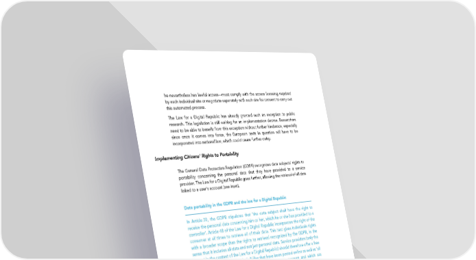 he nevertheless has lawful access—must comply with the access licensing required by each individual site or negotiate separately with each site for consent to carry out this automated process. The Law for a Digital Republic has already granted such an exception to public research. This legislation is still waiting for an implementation decree. Researchers need to be able to benefit from this exception without further hindrance, especially since once it comes into force, the European texts in question will have to be incorporated into national law, which could cause further delay. Implementing Citizens’ Rights to Portability The General Data Protection Regulation (GDPR) recognizes data subjects’ rights to portability concerning the personal data that they have provided to a service provider. The Law for a Digital Republic goes further, allowing the retrieval of all data linked to a user’s account (see inset). Data portability in the GDPR and the law for a Digital Republic In Article 20, the GDPR stipulates that ‘the data subject shall have the right to receive the personal data concerning him or her, which he or she has provided to a controller’. Article 48 of the Law for a Digital Republic incorporates the right of the consumer at all times to retrieve all of their data. This text gives individuals rights with a broader scope than the rights to retrieval recognized by the GDPR, in the sense that it includes all data and not just personal data. Service providers (only the largest in the context of the Law for a Digital Republic) should therefore offer a free facility that allows the retrieval of all files that have been posted online as well as ‘all data resulting from the consumer’s use of his/her user account and which are consultable online by the latter, with the exception of those that have been significantly enriched by the provider in question’. Provision is also made for the consumer to retrieve other data linked to a user account, the perimeters of which have been defined by decree. The law concerning the portability of data is one of the major innovations in recent French and European texts. In practice, all citizens may exercise this right in order to migrate from one service ecosystem to another without relinquishing their digital history. The exercise of this right could be declined in the case of ‘civic’ AI applications: it is conceivable, in the medium term, that citizens might decide to retrieve their data from various services so as to make them available to a public stakeholder or a stakeholder in scientific research for the benefit of missions of general interest. The possibilities are numerous and exciting: in terms of health, for example, patient communities might respond to a call from a research institute that is committed to developing artificial intelligence that will make it possible to improve the detection and treatment of certain pathologies. A mayor might appeal to his constituents for the data that they have retrieved from transport applications for the purpose of optimizing traffic in his/her municipality. Using appeals for blood donation as an example, it is possible to imagine significant campaigns at municipal, regional and 30