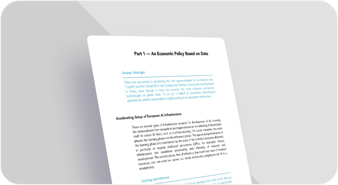 Part 1 — An Economic Policy Based on Data Sunway TaihuLight China has succeeded in producing the first supercomputer to be listed in the ‘Top500’ and the ‘Green500’s’ top 5 using only Chinese components manufactured in China, even though it does not possess the most advanced production technologies at global level. To do so, it relied on preceding technological generations, which it succeeded in implementing in an innovative architecture. Accelerating Setup of European AI Infrastructure There are several types of infrastructure required for development of AI, covering the various phases from research to development and on to marketing of the product itself. In certain AI fields, such as machine learning, life cycles comprise two main phases: the learning phase and the inference phase. The speed and performance of the learning phase are conditioned by the scale of the material resources allocated, in particular as regards dedicated processors (GPUs, for example). Hence, infrastructure size conditions productivity and efficiency of research and development. The second phase, that of inference, has much less need of material resources, and can even be carried out inside embedded peripheries (an AI in a smartphone). Learning and Inference This is basically how AI techniques based on learning work: first of all, they go through a learning phase during which an algorithm seeks out all parameters enabling the model to carry out the required task at the best possible performance level. Once this phase is over and the model’s parameters are set, an inference phase follows in which the task for which the model has been trained during the learning phase is carried out. During the learning phase, one must distinguish between several types of workflows. Cases in which a supercomputer dedicated to AI calculation is fully mobilized (typically with resources numbered in thousands of GPUs) are quite rare and only concern a limited field of research. The great majority of applications require far fewer resources (numbered in dozens of GPUs, for example). This type of need that could well be met by an “AI cloud”. Setup of such an infrastructure requires very considerable investment and is the preserve of a specialized branch of activity: infrastructure, data centers and the cloud itself have to be taken into account. It is therefore a matter of pooling such resources as far as possible, at least for the public authorities overseeing the development of key sectors. 53