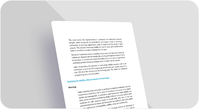 This could involve the implementation of dedicated and multiannual streamed budgets, which incorporate the potential for cost-savings in order to encourage examination of promising applications, study of impacts and the launch of pilot projects. This concerns increasing flexibility in order to seize upon transformations linked to AI within an adapted working mode and pace. This level of dedication makes it possible to move away from short-term needs; the multiannual, streamed element enables the evolving and responsive nature of AI to be broached, in contrast with annual scheduling tools, in as much as opportunities continually present themselves, projects come to fruition, fail and succeed. Lastly, incorporating the potential for cost-savings enables negative costs to be incentivized, so as to avoid favoring saving one euro next year, against saving 10 or even 100 times this amount over the following years. The vehicle for multiannual programming laws could be studied. Developing the reliability, safety and security of AI technology Metrology Public authorities must act in order to develop and implement standards, tests and measurement methods in a bid to make AI technology more secure, more reliable, useable and interoperable. In contrast to expert systems for which reliability and safety can be developed and tested by design (in theory in any case), systems which implement AI make decisions based on models built using data. In this way, protocols should be developed and incorporate new metrics in order to be applied to data, performance, interoperability, usability, safety and confidentiality. In this regard, responsibilities of the LNE (Laboratoire National de Métrologie et d’évaluation —French National Laboratory of Metrology and Testing) could be expanded, within the realms of its historical remit, for it to become the competent authority in terms of assessment (for metrology) in the field of AI, and to build test methods required in order to achieve this. Safety Whilst AI fosters the emergence of new opportunities, it also fosters the emergence of new threats. A case study on this topic was the subject of recent publications which showed that it was possible to arbitrarily skew results produced by certain models informed by neural networks, which poses a significant safety issue for critical Whilst AI fosters the applications. emergence of new The example of the driverless car is significant opportunities, it also in this regard: the existence of means used to fosters the emergence of skew its perception of the surroundings (deliberately causing poor interpretation of a new threats stop sign, for example) could cause severe incidents. Safety is therefore a significant subject, notably for critical systems and systems with a physical component capable of causing damage in the event of attack. 58