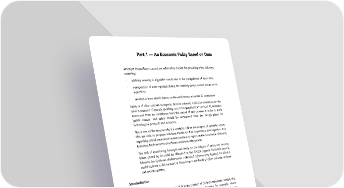 Part 1 — An Economic Policy Based on Data Amongst the problems raised, we will notably discuss the possibility of the following occurring: - arbitrary skewing of algorithm results due to the manipulation of input data; - manipulation of data inputted during the learning period carried out by an AI algorithm; - creation of new attacks based on the weaknesses of current AI techniques. Safety is of clear concern to experts, but not uniquely. Collective awareness on the issue is required. Generally speaking, and more specifically in terms of AI, collective awareness must be considered from the outset of any process in order to avoid ‘patch’ culture, and safety should be considered from the design phase for technological products and solutions. This is one of the reasons why it is useful to call on the support of specialist actors, who are able to propose solutions thanks to their experience and expertise. It is especially critical since recent events continue to report on the occurrence of security breaches, both in terms of software and material products. The task of monitoring, foresight and study on the subject of safety and security issues posed by AI could be allocated to the ANSSI (Agence Nationale pour la Sécurité des Systèmes d’information —National Cybersecurity Agency), for which it could facilitate a skill network at State-level in the fields of cyber defense, defense and critical systems. Standardization One of the specific aspects of AI is the creation of de facto standards, notably of a technological nature: this is the case for deep learning for example, where technology such as TensorFlow (developed by Google) was adopted by an overwhelming market majority as soon as it was released, whether by individuals, startups or academics. Whilst these building blocks may avoid an ecosystem in which the same solutions are continually reinvented, they contribute to enforcing de facto standards. This situation could prove to be highly detrimental if members of GAFAM (Google, Apple, Facebook, Amazon, and Microsoft), who remain the beneficiaries, decide to recover all of the developments made in AI that they enable. As such, the greatest risk in terms of AI is not presented by the algorithms themselves, but rather by the technology (and human) “stack” which facilitates their implementation. In this context, standardization is not conceivable without maintaining very tight connections with the ecosystem as a whole: research, industry, innovation. This approach must consist of reducing the trend for monopolization and logic of confinement. It will notably concern the establishment and application of non- proprietary interoperability standards within a proactive and coordinated approach, as well as local outputs for personal and non-personal data production tools. 59