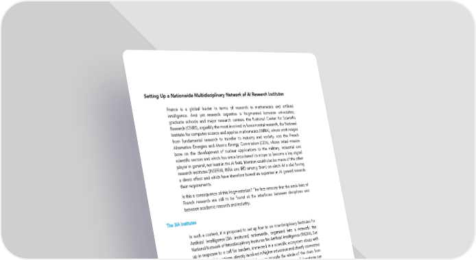 Setting Up a Nationwide Multidisciplinary Network of AI Research Institutes France is a global leader in terms of research in mathematics and artificial intelligence. And yet research expertise is fragmented between universities, graduate schools and major research centers: the National Center for Scientific Research (CNRS), arguably the most involved in fundamental research, the National Institute for computer science and applied mathematics (INRIA), whose work ranges from fundamental research to transfer to industry and society, and the French Alternative Energies and Atomic Energy Commission (CEA), whose initial mission bore on the development of nuclear applications to the military, industrial and scientific sectors and which has since broadened its scope to become a key digital player in general, not least in the AI field. Mention could also be made of the other research institutes (INSERM, INRA and IRD among them) on which AI is also having a direct effect and which have therefore honed an expertise in AI geared towards their requirements. Is this a consequence of this fragmentation? The fact remains that the weak links of French research are still to be found at the interfaces: between disciplines and between academic research and industry. The 3IA institutes In such a context, it is proposed to set up four to six Interdisciplinary Institutes for Artificial Intelligence (3IA institutes) nationwide, organized into a network: the National Network of Interdisciplinary Institutes for Artificial Intelligence (RN3IA). Set up in response to a call for tenders, immersed in a scientific ecosystem abuzz with potential collaborations, directly involved in higher education and closely connected with industry, these 3IA institutes will have to provide the whole of the chain from research right through to innovation with fora where productive collaborations can take place and knowledge associated with AI can be shared—and providing a significant proportion of the motivated stakeholders concerned (researchers, students, entrepreneurs) with direct access to cutting-edge research. In terms of research and innovation, the RN3IA will ensure national coverage of the AI fields by fostering the geographic and thematic diversification of the institutes: efforts will be made to avoid thematic redundancy between institutes, particularly as regards application fields or multidisciplinary research. The research themes More specifically, regarding research themes, a balance will be sought between concentrating endeavors and financing on the star subjects of the moment, and uniformly allocating across all present and past themes. The scientifically and economically dominant themes of the moment (learning, and the different strands of data science, or data analytics, also known as Big Data) need to be delved into further; semi or unsupervised learning, reinforcement learning, representation learning and domain transfer as well as unstructured data learning (textual data, tweets, blogs and other electronic media for example) also need to be on the programme, widening the scope beyond deep learning alone. 64