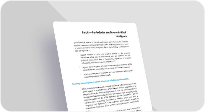 Part 6 — For Inclusive and Diverse Artificial Intelligence prove beneficial in order to attune to and reassure users. However, this has raised significant issues concerning user perception of the technology, as well as the extent to which it is deemed socially acceptable. Before the technology is considered for use, it is important to: - support research in social and cognitive sciences on the emotional attachments which may develop between users and machines, and their potential consequences (risk of dependence, exploitation of emotional vulnerability, confusion with human empathy, etc.); - regulate the development of bodies of data on emotions obtained in real-life contexts and their potential use for commercial or surveillance purposes; - initiate social debate on the position and role of automated machines used to support dependent or disabled people. Promoting the development of assistive technologies to facilitate digital accessibility Whilst accessibility requirements for digital interfaces aimed at disabled people are usually applied as an afterthought, certain AI-based solutions enable them to be integrated during the interface design phase. AI could also provide assistance to interface developers and designers thanks to automated digital accessibility testing tools (compliance with the RGAA [Référentiel Général d’Accessibilité - General Administrations Accessibility Guidelines]) or interface design tools (such as ‘Thegrid.io’ and ‘textocode’). Public authorities could therefore support the development of such tools and/or promote their usage as part of the accessibility policy. Long-term, ex-ante consideration of accessibility rules could become less significant in view of advancements in assistive technology. Certain AI-based assistive technology can improve the living conditions of disabled people; for example, Facebook has developed an object recognition tool for the visually impaired which can be adapted to user preferences and interests. Google’s ‘DeepMind’ tool uses automated lip-reading technology to enable hearing-impaired people to better understand and reproduce conversations. Salesforce recently launched an algorithm which uses machine-learning to summarize and produce texts and for people suffering from attention disorders. Public authorities could simulate the development of AI applications focused on dependence and disability, and in this sense: - support investment efforts focused on AI projects within the sphere of dependence and disability, such as the venture capital fund dedicated to artificial intelligence launched by Microsoft in 2017; - encourage the development of partnerships on AI technology combining businesses, associations, care networks, and research establishments. 147