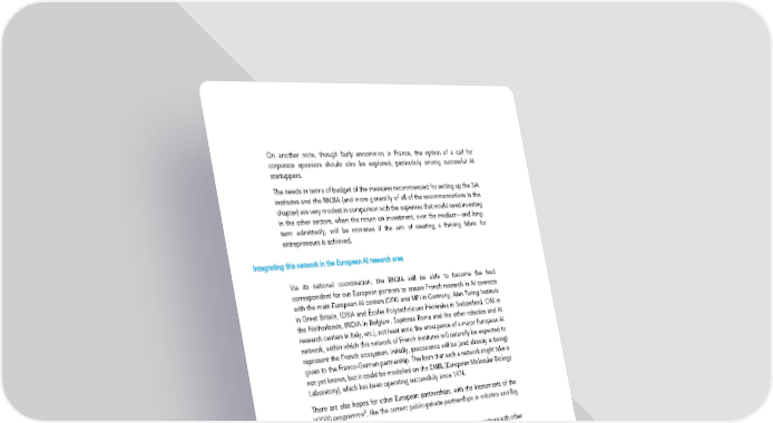 On another note, though fairly uncommon in France, the option of a call for corporate sponsors should also be explored, particularly among successful AI startuppers. The needs in terms of budget of the measures recommended for setting up the 3IA institutes and the RN3IA (and more generally of all of the recommendations in this chapter) are very modest in comparison with the expenses that would need investing in the other sectors, when the return on investment, over the medium—and long- term admittedly, will be immense if the aim of creating a thriving fabric for entrepreneurs is achieved. Integrating this network in the European AI research area Via its national coordination, the RN3IA will be able to become the lead correspondent for our European partners to ensure French research in AI connects with the main European AI centers (DFKI and MPI in Germany, Alan Turing Institute in Great Britain, IDSIA and Écoles Polytechniques Fédérales in Switzerland, CWI in the Netherlands, IRIDIA in Belgium, Sapienza Roma and the other robotics and AI research centers in Italy, etc.), not least amid the emergence of a major European AI network, within which this network of French institutes will naturally be expected to represent the French ecosystem. Initially, precedence will be (and already is being) given to the Franco-German partnership. The form that such a network might take is not yet known, but it could be modelled on the EMBL (European Molecular Biology Laboratory), which has been operating successfully since 1974. There are also hopes for other European partnerships, with the instruments of the H2020 programme8, like the current public-private partnerships in robotics and Big Data. But each 3IA institute will, of course, be given scope to forge cooperations with other partners, whether or not European, based on its specific features and the personal relationships of its researchers. We have partnerships in place with our counterparts in Quebec, for example, which would be worth nurturing with respect to the momentum in AI that is gathering at the moment. A stronger researcher presence alongside French Tech entrepreneurs must also be encouraged at flagship European or international events (Consumer Electronic Show, Web Summit and Founders Lisbon for example). 2. Computing Means for Research The 3IA institutes must have computing tools at their disposal that can rival the almost unlimited means of the leading private stakeholders. There are, however, a number of needs, of different types, which cover the different stages of research, development and life of products. Indeed, in some areas such as machine learning, the development cycle entails two key stages: learning and inference. The speed and performance of the learning stage depend on the scale of physical means devoted to them, particularly in terms of dedicated processors (mainly GPUs today). 8. Horizon 2020, the current EU Research and Innovation programme. 74