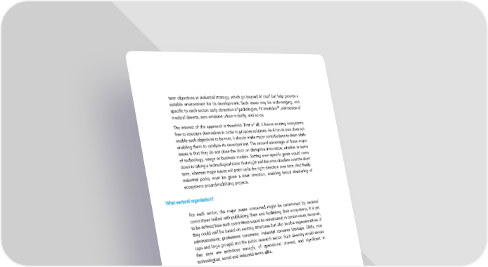 term objectives in industrial strategy, which go beyond AI itself but help provide a suitable environment for its development. Such issues may be wide-ranging, and specific to each sector: early detection of pathologies, P4 medicine20, elimination of medical deserts, zero-emission urban mobility, and so on. The interest of this approach is threefold. First of all, it leaves existing ecosystems free to structure themselves in order to propose solutions. As AI on its own does not enable such objectives to be met, it should make major contributions to them while enabling them to catalyze its development. The second advantage of these major issues is that they do not close the door on disruptive innovation, whether in terms of technology, usage or business models. Setting over-specific goals would come down to taking a technological stand that might well become obsolete over the short term, whereas major issues will point us in the right direction over time. And finally, industrial policy must be given a clear direction, enabling broad structuring of ecosystems around mobilizing projects. What sectoral organization? For each sector, the major issues concerned might be determined by sectoral committees tasked with publicizing them and facilitating their ecosystems. It is yet to be defined how such committees would be constituted; in certain cases, however, they could well be based on existing structures but also involve representatives of administrations, professions concerned, industrial concerns (startups, SMEs, mid- caps and large groups) and the public research sector. Such diversity would ensure that aims are ambitious enough, of operational interest, and significant in technological, social and industrial terms alike. What funding? Issues determined would be integrated into the conventional innovation-support systems overseen by BPI France21, which could be complemented by special schemes: - Fluctuating subsidies for provision of aid to development of highly innovative products. Fluctuation would enable examination of projects throughout the year and assign aid along the way as required. Inspiration might be drawn from the RAPID scheme (Régime d’APpui à l’Innovation Duale/ Regime for Support to Dual-use Innovation) implemented by the Defense Procurement Directorate (DGA) to ensure aid is provided within 3 months for approved applications. - Competitions, models of which have already been implemented22 and overseen by BPIFrance. They could possibly comprise a series of phases, with aid awarded becoming increasingly significant. 20. Predictive, preventive, personalized and participatory medicine. 21. Such as funding of collaborative R&D projects and funding of R&D. 22. In the context of the Investment for the Future programmes, to the tune of €35m and €40m per annum respectively for the world innovation competition and digital innovation competition. 44