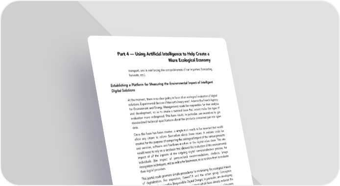 Part 4 — Using Artificial Intelligence to Help Create a More Ecological Economy transport, and in reinforcing the competitiveness of our importers (forecasting harvests, etc.). Establishing a Platform for Measuring the Environmental Impact of Intelligent Digital Solutions At the moment, there is no clear policy in favor of an ecological evaluation of digital solutions. Experimental devices of this sort already exist3. Ademe (the French Agency for Environment and Energy Management) could be responsible for their analysis and development, so as to create a national base that would make this type of evaluation more widespread. This base could, in particular, use incentives to get standardized technical specifications about the products concerned put into open data. Once this base has been created, a simple tool needs to be invented that would allow any citizen to inform themselves about these issues. A website could be created for the purpose of comparing the ecological impact of the various products and services, software and hardware involved in the digital value chain. This site would need to rely on a database that allowed the evaluation of the environmental impact of all the aspects of the ongoing digital dematerialization process, for individuals (the impact of personalized recommendations, chatbots, image recognition techniques, etc) as well as for businesses, so as to allow them to evaluate their digital providers. This portal could promote simple procedures for minimizing the ecological impact of digitalization. For inspiration, GreenIT.fr and the action group Conception Numérique Responsable (Responsible Digital Design), in particular, are developing a green approach to design and ecological tools which have already reduced the impact of one digital service by a third, whilst improving the experience of its users. It could be accompanied by incentives to put the technical characteristics of products into open data. This comparative approach could make it possible to promote smaller operators and new business models, rather than the most frequently used solutions and services. Apart from this platform and this site, a broader initiative could be introduced that would encourage businesses to use an ecological approach. Ademe could have a role to play in the design and circulation of an evaluation reference system and in the ecological design of intelligent digital innovations. 3. Designing AI that Uses Less Energy Recent progress in AI has largely been due to the increased use of GPUs, graphics processors, to carry out general-purpose and massively parallel computing. However, like the overwhelming majority of chips, these use silicon in their electrical circuits and transistors. 3. See the Conception Numérique Responsable (Responsible Digital Design) action group’s tool ecoindex.fr, for example 105