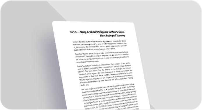 Part 4 — Using Artificial Intelligence to Help Create a More Ecological Economy sections that focus on the different industries (agriculture and transport). It is obvious that there is enormous potential for using AI in the energy sector; however, in view of the economic characteristics of the sector, a specific initiative on the part of the public authorities would not necessarily appear to be a priority. OpenSolarMap has proved that great value can be inherent in the most traditional of databases6. We need to leverage all the public data that concerns our territories, our homes, our energy consumption, etc. to assist us in developing AI solutions for the ecological transition process. French legislation is beginning to take on board the importance of data and the need to share it, particularly where it relates to the concept of data of general interest7. The latest report from the Ministry for the Ecological and Inclusive Transition8, which registers the public databases in its domain, demonstrates the large volume of data which is now available. The move undertaken by this same Ministry regarding mapping and data usage should be encouraged, fast-tracked, even extended and linked to other Ministries’ data policies (Agriculture, Housing, Health, etc). This move ought to go hand in hand with informing public stakeholders in ecology about the potential offered by AI. In particular, this would identify the Ministry’s current missions and programmes which could then be accomplished more easily with help from AI, following the example of environmental policing and the updating of certain bases using new image-recognition techniques. To prepare for this move, an ‘Intelligent Review’ of environmental policies could be introduced at national and local levels: climate plans, Agenda 21 programmes, waste prevention schemes, transport plans, the SNTEDD (the stratégie nationale de transition écologique vers un développement durable, the National Strategy for Ecological Transition towards Sustainable Development), etc. in the light of AI solutions which could maximize their impact. The review’s objective would be to ensure that these strategies were taking advantage of the potential offered by AI. In addition, AI specialists need to be involved in defining any new public environmental strategies. Releasing Public Data In order to develop AI solutions for the ecological transition process, it is crucial to make public data (meteorological, agricultural, transport, energy, biodiversity, climate, waste, land registry, energy performance analysis, etc) available to everyone—European researchers and businesses alike—ideally before 2019. This release of data could encourage innovations which pave the way for rapid action: 6. The OpenSolarMap project relies first of all on data from land registries, before involving data from satellites and other contributions. 7. Notably via the Law for a Digital Republic. However, in terms of the environment, European directives concerning environmental and geographical information are an invitation to even greater access to information that concerns the environment, and recent French legislation concerning the energy transition process and green growth or alternatively the legislation concerning biodiversity, including measures which make the sharing of data obligatory. Aware of the importance of the subject, the Ministry for the Ecological and Inclusive Transition was also provided with a Supervisor-General for Data in 2016. 8. See the CGEDD Data Mapping Report from the Ministry of the Environment, Energy and the Seas. 109