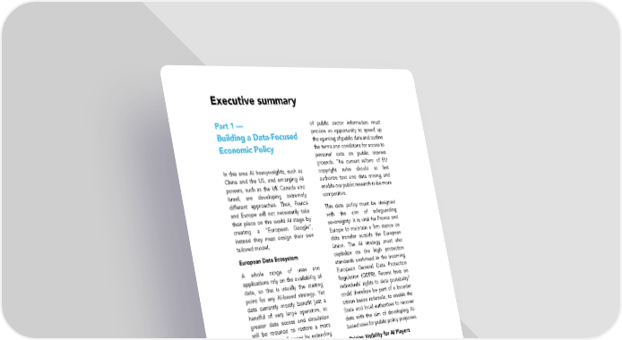 Executive summary Part 1 — of public sector information must Building a Data-Focused provide an opportunity to speed up the opening of public data and outline Economic Policy the terms and conditions for access to personal data on public interest grounds. The current reform of EU In this area AI heavyweights, such as copyright rules should at last China and the US, and emerging AI authorize text and data mining and powers, such as the UK Canada and enable our public research to be more Israel, are developing extremely competitive. different approaches. Thus, France This data policy must be designed and Europe will not necessarily take with the aim of safeguarding their place on the world AI stage by sovereignty: it is vital for France and creating a “European Google”, Europe to maintain a firm stance on instead they must design their own data transfer outside the European tailored model. Union. The AI strategy must also European Data Ecosystem capitalize on the high protection A whole range of uses and standards enshrined in the incoming applications rely on the availability of European General Data Protection data, so this is usually the starting Regulation (GDPR). Recent laws on 2 point for any AI-based strategy. Yet individuals’ rights to data portability data currently mostly benefit just a could therefore be part of a broader handful of very large operators, so citizen-based rationale, to enable the greater data access and circulation State and local authorities to recover will be required to restore a more data with the aim of developing AI- even balance of power by extending based uses for public policy purposes. these benefits to government Raising Visibility for AI Players authorities, as well as smaller France has all the required assets to economic actors and public research. take its rightful place on the For this to happen, the public international arena, yet our authorities must introduce new ways companies and academic networks of producing, sharing and governing suffer from a lack of visibility both in data by making data a common Europe and overseas. Large 1 good . This should involve companies sometimes opt to rely on encouraging economic players to dominant world actors in the sector, share and pool their data, with the rather than entrusting their data to our State acting as a trusted third party. In home-grown talent, either because some circumstances, public they are not aware of this wealth of authorities could impose openness on skills within the country or because certain data of public interest. they prefer to adopt a very cautious Meanwhile in Europe, a number of approach. Our mission therefore reforms currently underway must suggests bringing together French AI provide for greater access and wider actors under a unique and strong circulation of data. The forthcoming banner, which would include revision to the directive on the re-use certifications and “innovation in the 1. Common goods refer to resources where 2. Users’ ability to receive their personal use and governance are defined by a data for their own use or to transmit to community. another data controller. 8