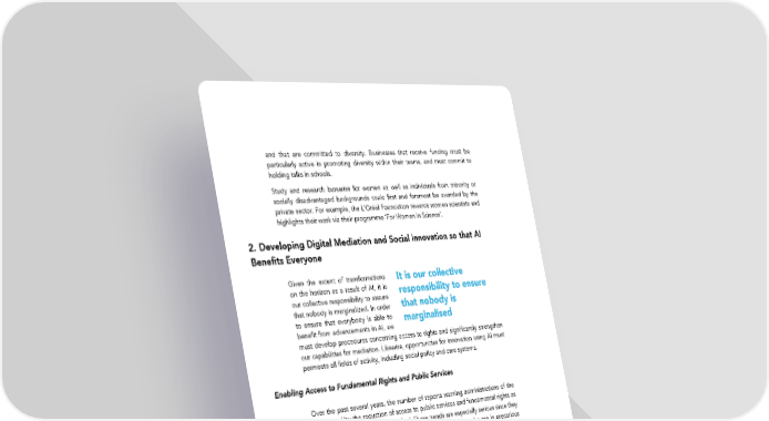 and that are committed to diversity. Businesses that receive funding must be particularly active in promoting diversity within their teams, and must commit to holding talks in schools. Study and research bursaries for women as well as individuals from minority or socially disadvantaged backgrounds could first and foremost be awarded by the private sector. For example, the L’Oréal Foundation rewards women scientists and highlights their work via their programme ‘For Women in Science’. 2. Developing Digital Mediation and Social Innovation so that AI Benefits Everyone Given the extent of transformations It is our collective on the horizon as a result of AI, it is responsibility to ensure our collective responsibility to ensure that nobody is that nobody is marginalized. In order to ensure that everybody is able to marginalised benefit from advancements in AI, we must develop procedures concerning access to rights and significantly strengthen our capabilities for mediation. Likewise, opportunities for innovation using AI must permeate all fields of activity, including social policy and care systems. Enabling Access to Fundamental Rights and Public Services Over the past several years, the number of reports warning administrations of the risks posed by the reduction of access to public services and fundamental rights as a result of digitization have multiplied. These trends are especially serious since they affect a substantial part of the population, particularly those who are in precarious situations and/or alienated from digital technology (see inset), and also since they are likely to intensify over the coming years. 12 million French citizens experience difficulties carrying out common administrative procedures According to an investigation by the French Defender of Rights published in February 2017, approximately 12 million French people experience difficulties performing common administrative procedures, such as declaring taxes online and downloading or completing online forms. These difficulties result in 12% of users abandoning procedures, which notably concern the legal system (36%), the Trésor public (Inland Revenue) (14%) and social security bodies (13%). In order for the transformation of administrative procedures using AI to improve access to rights rather than encourage polarization, the strategy used by administrations must be twofold. On the one hand, it must be focused on improving public knowledge of administrative rules and their application in personal circumstances, to the extent of automating certain recurring procedures. On the 142