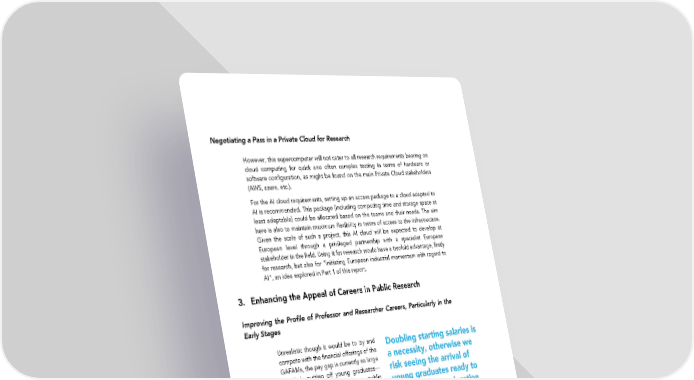 Negotiating a Pass in a Private Cloud for Research However, this supercomputer will not cater to all research requirements bearing on cloud computing for quick and often complex testing in terms of hardware or software configuration, as might be found on the main Private Cloud stakeholders (AWS, azure, etc.). For the AI cloud requirements, setting up an access package to a cloud adapted to AI is recommended. This package (including computing time and storage space at least adaptable) could be allocated based on the teams and their needs. The aim here is also to maintain maximum flexibility in terms of access to the infrastructure. Given the scale of such a project, this AI cloud will be expected to develop at European level through a privileged partnership with a specialist European stakeholder in the field. Using it for research would have a twofold advantage, firstly for research, but also for "initiating European industrial momentum with regard to AI", an idea explored in Part 1 of this report. 3. Enhancing the Appeal of Careers in Public Research Improving the Profile of Professor and Researcher Careers, Particularly in the Early Stages Unrealistic though it would be to try and Doubling starting salaries is compete with the financial offerings of the a necessity, otherwise we GAFAMs, the pay gap is currently so large that it is putting off young graduates— risk seeing the arrival of even those most attached to public young graduates ready to research and the common good. At least invest in higher education doubling starting salaries is a necessity, otherwise we risk seeing the arrival of and academic research dry young graduates ready to invest in higher up completely education and academic research dry up completely. Increasing France's Appeal in the Eyes of Expatriate or Foreign Talent The status of permanent researcher is one of the last surviving advantages that French research has over all of its competitors, whether we are talking about the major digital industries or public institutions abroad (Europe included), and it is often the only argument to counter the eye-popping salaries offered. But for a senior researcher, entering the French system is a very big step financially speaking (buying back pension contributions over a long period), which could partly be accomplished with ad hoc assistance, something which seems nigh on impossible today. Other measures of ad hoc assistance could also be considered on a case-by-case basis (see the recommendations concerning 3IA institutes that are not intended to be limited to the RN3IA.). Similar assistance should also be offered for national mobility schemes, so as not to put at an indirect disadvantage researchers who already have permanent positions in France, thereby paradoxically creating 76