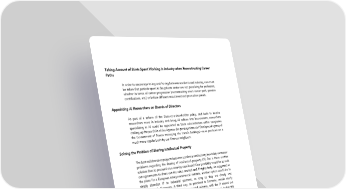 Taking Account of Stints Spent Working in Industry when Reconstructing Career Paths In order to encourage to-ing and fro-ing between academia and industry, care must be taken that periods spent in the private sector are not penalizing for professors, whether in terms of career progression (reconstructing one's career path, pension contributions, etc.) or before different recruitment and promotion panels. Appointing AI Researchers on Boards of Directors As part of a reform of the State-as-a-shareholder policy, and both to involve researchers more in industry and bring AI culture into boardrooms, researchers specializing in AI could be appointed as State administrators within companies making up the portfolio of the Agence des participations de l’État (special agency of the Government of France managing the State's holdings)—as is practiced on a much more regular basis by our German neighbors. Solving the Problem of Sharing Intellectual Property The best collaborative projects between academia and industry inevitably encounter problems regarding the sharing of intellectual property (IP). But is there another solution than to proceed on a case-by-case basis? One possibility would be to seek out agreements to share out the value created and IP rights fairly. As suggested in the plans for a European intergovernmental institute, another option would be to simply abandon IP to industrial partners, as long as they are clearly and unambiguously European. A third way, as practiced in Germany, entails clearly separating out the applicative and fundamental spheres, with the IP shared out accordingly. What strikes as essential, whatever approach is adopted, is that this does not become a stumbling block or factor in holding up common projects. Encouraging Researchers to Create Startups A civil servant wishing to create a startup on the basis of his or her research findings must also be given encouragement, for example by providing financial assistance for 2–3 years in the early stages and/or free hosting in an incubator for startups—as well as systematically granted leave of absence (for the same duration). The IP should also be subject to an agreement between the institution which produced the research and the startup (see above). There are several possible models, from holding shares (this is prohibited for public institutes today) to revenue sharing agreements, which still need looking into, and could be proposed to entrepreneurs. One of the key points is to keep up with the very quick pace of innovation in the AI sector and to have correspondents for the legal and financial setups who understand what is at stake in these situations. Examples now exist, such as the venture capital fund, Partech Fund, launched by the Université Paris-Saclay. 78