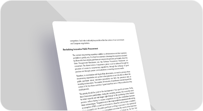 competition. Such rule could only be possible within the context of real commitment and European negotiations. Revitalizing Innovative Public Procurement The contract engineering capacities available to administrations and their operators are liable to greatly vary. It is therefore essential to leverage the experience acquired by those who have already put these procedures into practice, particularly where the State Procurement Directorate and the Defense Procurement Directorate are concerned. The dissemination of experience gained could be achieved through the provision of access to documentary repositories, through the exchange of good practice and through greater communications concerning concrete results. Therefore, in coordination with legal affairs directorates, we need to produce these documentary repositories and guides to best practice so as to be able to inform the public purchaser about innovative procedures and limit the perceived risks in investing in innovation. The creation of networks of purchasers extends beyond the context of AI, but these could be of great benefit in terms of the acculturation they would provide. The priority should be given to the development of two specific processes. Firstly, that of innovative partnerships: during the tendering process, this covers the need for initial research and trial stages right through to the purchasing of the finished product, without having to reopen competition among the stakeholders between these various stages. This point is one of the major problems associated with making an exception of R&D, a point we will return to: when the work has been completed, if it is successful and the public purchaser is willing to proceed to the operational stage, he is obliged to reopen competition even when the results of the trials have been satisfactory and promising. The situation is not helped by the fact that frequently, as a result of this reopening of competition and after it has already undergone trials, there is found to be no market for producing the finished version of the solution, very often for financial reasons. The second mechanism of interest in terms of innovative procurement is competitive dialogue. This is a suitable solution for complex procurement contracts, in which the public purchaser is not able to define alone and in advance the type of technology that would meet his requirements, or alternatively for which he is not in a position to set up a suitable legal or financial arrangement. This process offers public purchasers the possibility of a much broader dialogue with tenderers, with the aim of improving the quality and the innovative nature of the proposals that are submitted to them; it is not a means to accelerate matters. Broader communications could come from purchasers who have had a successful experience with innovative procedures, especially when they have only been made use of to a limited extent, as in the case of innovative partnerships. We should, however, bear in mind that the implementation of these processes, which are very costly, requires a high level of commitment from administrations. 38