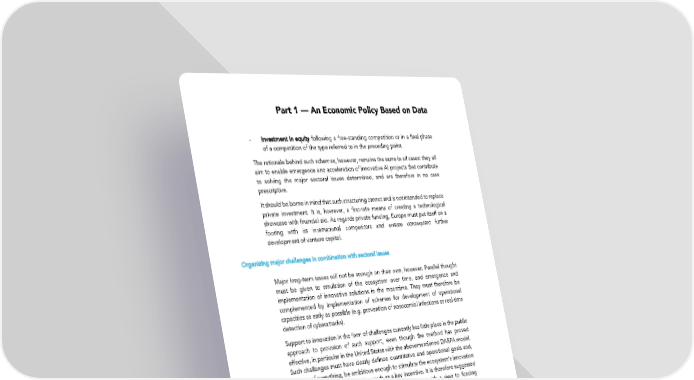 Part 1 — An Economic Policy Based on Data - Investment in equity following a free-standing competition or in a final phase of a competition of the type referred to in the preceding point. The rationale behind such schemes, however, remains the same in all cases: they all aim to enable emergence and acceleration of innovative AI projects that contribute to solving the major sectoral issues determined, and are therefore in no case prescriptive. It should be borne in mind that such structuring cannot and is not intended to replace private investment. It is, however, a first-rate means of creating a technological showcase with financial aid. As regards private funding, Europe must put itself on a footing with its international competitors and ensure consequent further development of venture capital. Organizing major challenges in combination with sectoral issues Major long-term issues will not be enough on their own, however. Parallel thought must be given to emulation of the ecosystem over time, and emergence and implementation of innovative solutions in the meantime. They must therefore be complemented by implementation of schemes for development of operational capacities as early as possible (e.g. prevention of nosocomial infections or real-time detection of cyberattacks). Support to innovation in the form of challenges currently has little place in the public approach to provision of such support, even though the method has proved effective, in particular in the United States with the abovementioned DARPA model. Such challenges must have clearly defined quantitative and operational goals and, in spite of everything, be ambitious enough to stimulate the ecosystem’s innovation capacities, with major financial rewards as a key incentive. It is therefore suggested that innovation challenges be organized in each sector, with a view to funding development of technologically ambitious operational capacities over the short term, which also contribute to advances made on major sectoral issues. The DARPA Grand Challenge DARPA held this competition in 2004 and 2005 (as well as in 2007 in an urban context), with the aim of developing fully autonomous ground vehicles capable of: - completing the selected course in under 10 hours; - using GPS and possibly other available civilian signals; - operating completely autonomously without receiving any orders while competing on the course; - not hitting any other vehicles intentionally during the competition. At the end of the competition, the 3 top teams were awarded prizes of $2m, $1m and $500,000 respectively. There could be a variety of ways of organizing such challenges, depending on objectives and on whether public purchasing was on the cards. It is essential, though, that such challenges involve all interested parties, from researchers to industrialists, 45