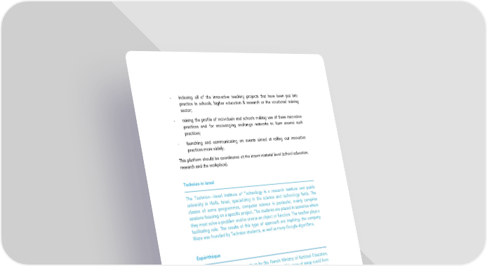 - indexing all of the innovative teaching projects that have been put into practice in schools, higher education & research or the vocational training sector; - raising the profile of individuals and schools making use of these innovative practices and for encouraging exchange networks to form around such practices; - launching and communicating on events aimed at rolling out innovative practices more widely. This platform should be coordinated at the interministerial level (school education, research and the workplace). Technion in Israel The Technion—Israel Institute of Technology is a research institute and public university in Haifa, Israel, specializing in the science and technology fields. The classes of some programmes, computer science in particular, mainly comprise sessions focusing on a specific project. The students are placed in scenarios where they must solve a problem and/or create an object or function. The teacher plays a facilitating role. The results of this type of approach are inspiring: the company Waze was founded by Technion students, as well as many Google algorithms. Expérithèque The Expérithèque platform, set up by the French Ministry of National Education, keeps a record of teaching innovations nationwide. This type of setup could form the basis of a future platform, which would more largely factor in the aforementioned aims and relies on a dedicated coordination function. Freeing Up Time and Means for Pioneers of Innovative Teaching Methods Along the same lines as what is done for general interest entrepreneurs, some individuals or institutions who are leading the way with groundbreaking teaching methods could be awarded special means for documenting and sharing their projects. Two points should be borne in mind, however, when setting about this: the point is not so much to single out individuals as it is to promote collective setups. The main aim of making resources available—or granting leave to teachers from certain teaching duties, for example—must then be to formally put together and disseminate innovative teaching experiences. The methods for recognizing this type of leave taken from traditional duties, in terms of career, must be developed. Creating a similar system for granting leave to staff who are not teachers should also be considered, to take into account the changes taking effect across all of the Ministry's occupations. 96