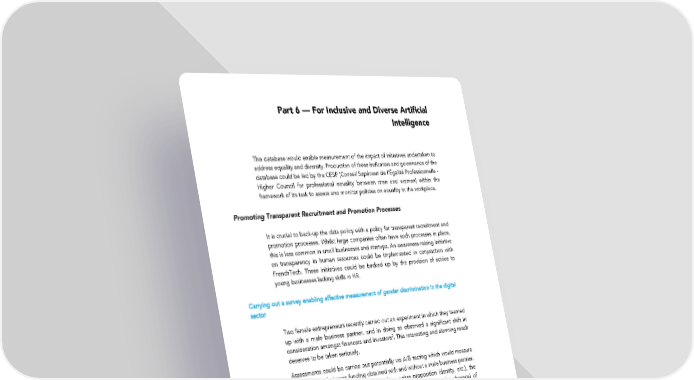 Part 6 — For Inclusive and Diverse Artificial Intelligence This database would enable measurement of the impact of initiatives undertaken to address equality and diversity. Production of these indicators and governance of the database could be led by the CESP (Conseil Supérieur de l’Égalité Professionnelle - Higher Council for professional equality between men and women) within the framework of its task to assess and monitor policies on equality in the workplace. Promoting Transparent Recruitment and Promotion Processes It is crucial to back-up the data policy with a policy for transparent recruitment and promotion processes. Whilst large companies often have such processes in place, this is less common in small businesses and startups. An awareness-raising initiative on transparency in human resources could be implemented in conjunction with FrenchTech. These initiatives could be backed up by the provision of advice to young businesses lacking skills in HR. Carrying out a survey enabling effective measurement of gender discrimination in the digital sector Two female entrepreneurs recently carried out an experiment in which they teamed up with a male business partner, and in doing so observed a significant shift in consideration amongst financers and investors2. This interesting and alarming result deserves to be taken seriously. Assessments could be carried out potentially via A/B testing which would measure the difference between funding obtained with and without a male business partner. All other factors being equal (qualifications, value proposition identity, etc.), the survey could facilitate improved measurement of the existence (or absence) of financial and recruitment biases and indeed any other decisive factors for career progression and the perception of women—by either women or men—in their relationship with ambition, competition and money. Promoting AI research in support of identifying discrimination Solutions capable of identifying workplace discrimination already exist. By analyzing surveys, employee statements, data on salaries and promotion, etc., the company Palantine Analytics was able to detect a number of biases working against women. It would be interesting to promote research which would enable similar solutions to be developed. Setting Aside Funds to Address Diversity Funding for projects working on the development of inclusive and non- discriminatory AI could be established at BPI France or FrenchTech, and equally for digital businesses working on projects with high social and environmental impact 2. Le Monde, “Comment deux entrepreneuses s’inventent un collègue masculin pour convaincre les investisseurs” (How two women invented a male colleague to win over investors), 8 September 2017. 141