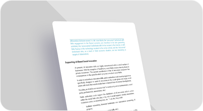 differentiate between several ‘at risk’ class labels: the ‘uncounted’ (individuals with little engagement in the formal economy and therefore in its data generating activities), the ‘unaccounted’ (individuals with limited access to the internet, or with little fluency in the technology required to be active online), and the ‘discounted’ (individuals who, as a result of their economic situation, are less interesting as targets of observation). Supporting AI-Based Social Innovation At present, AI innovation skills are highly concentrated within a small number of businesses. With the exception of healthcare, social fields receive minority shares in private investment. This current coordination of the AI innovation ecosystem has consequences on the speed in which progress is made in social fields. In order to redistribute innovation skills, public authorities could launch programmes specifically designed to assist AI innovation in the social sphere and equip social actors with tools that would enable them to benefit from AI-related developments. Providing an AI skills and resource hub for social policy actors (administration, social policy professionals, associations, etc.) Public authorities could support the distribution of AI innovation skills to actors within the social field who play a key role in social support, notably associations, mediation actors, social enterprises, etc. To do this, they could: - facilitate networking between businesses and associations concerning AI projects; - provide resources (data, computing skills, etc.); - create a hub of excellence (experts in AI, data science, etc) to enable associations to offer and develop social support prototypes using AI. Data for Good Data for Good is a community of over 300 engineers and data scientists who voluntarily put their skills to use to resolve large-scale social issues. An acceleration programme is launched three times a year in order to develop a dozen volunteer- led projects. During this 10-week programme, volunteers are paired with mentors and attend workshops to improve their skills. The following are examples of projects undertaken: predictive analysis for food assistance in partnership with the French Red Cross and mentorship matching in support of equal opportunities in partnership with the association, Frateli. Documenting the effects of robots in social support Combined progress in AI and robotics has also led to the emergence of new forms of health and social care: robots, or ‘automated assistants’. The development of empathy skills within these machines, or in other words, their ability to express a particular emotion to adapt to their human counterparts at any given time, may 146